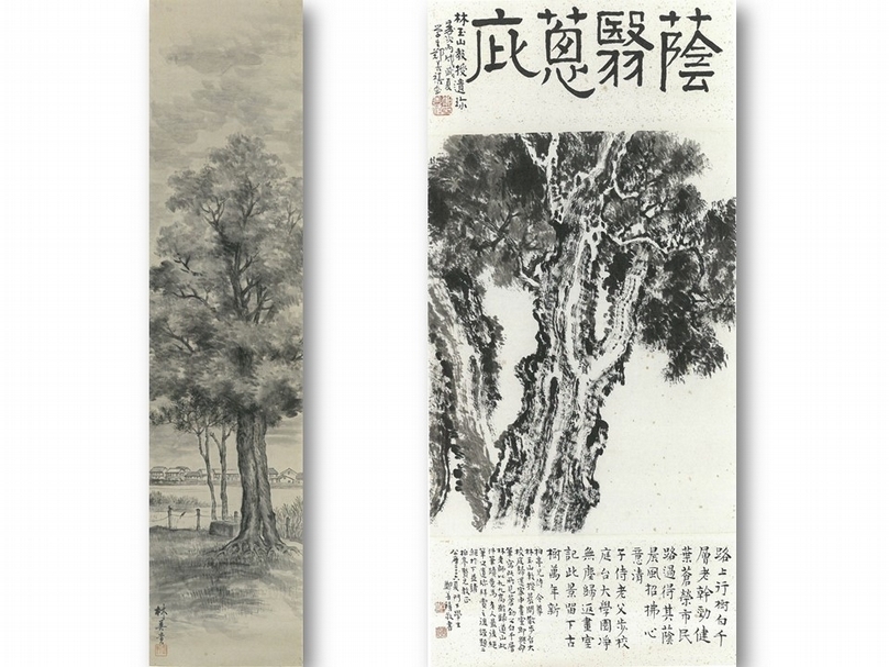 林玉山1926年《風景習作》(左),林玉山2004年《蔭翳蔥庇》(右),皆為國立台灣美術館藏。(吳佳靜提供)