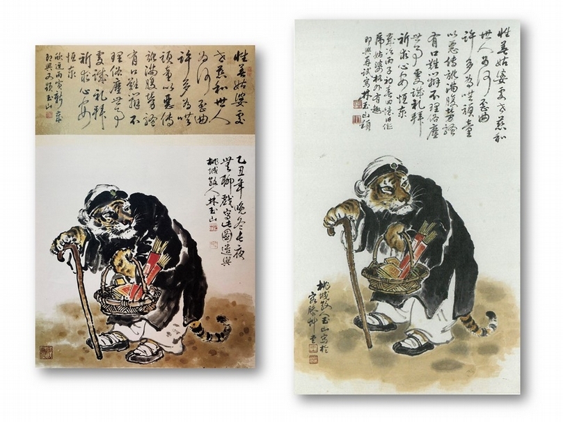 林玉山1985年《虎姑婆》(左),私人收藏。圖版引自林玉山、劉墉合編《林玉山畫論畫法》,台北:劉墉,1988,頁33。非此次展品。 林玉山1996年《虎姑婆》(右),國立台灣美術館藏。(吳佳靜提供)