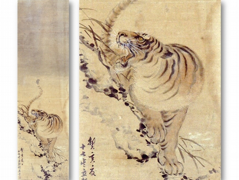 林玉山1923年《下山猛虎》,國立台灣美術館藏。右為局部。(吳佳靜提供)