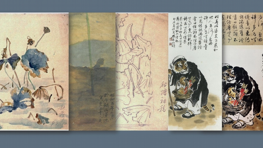 晚年的林玉山,在《松鶴圖》(1926)的右下角,提筆留下一段紀錄:「時隔六十七年重見此作,感慨萬千,舊日畫法雖有是非,猶可留念。」林玉山的一生,見證台灣政局的數次更迭,在文化與政治激烈擺盪的氛圍下創作數十載,想來「感慨萬千」的對象應不只是舊作的生澀樣貌,也包含自己一路以來的身分轉變與畫藝探索路程。本展將林玉山畫藝的起點與終點作品同時展出。《下山猛虎》是現存作品中最早的一幅,此時他年方十七,便以此作入選嘉義地區勸業共進會書畫部展覽,畫中猛虎比例正確、形態自然,雖非真實寫生,而是深究當時寫實虎畫作品與圖稿的模仿之作,卻已得見年少畫家的描繪天分。