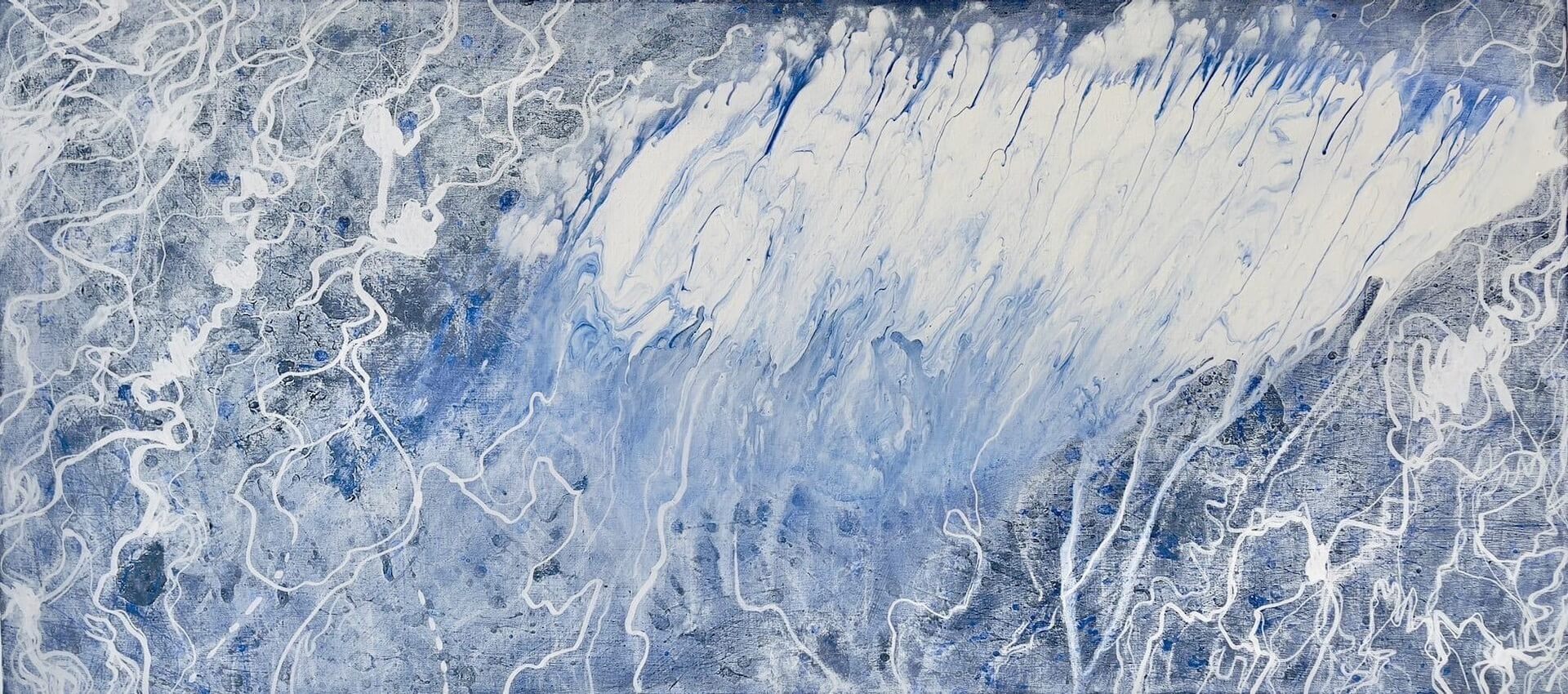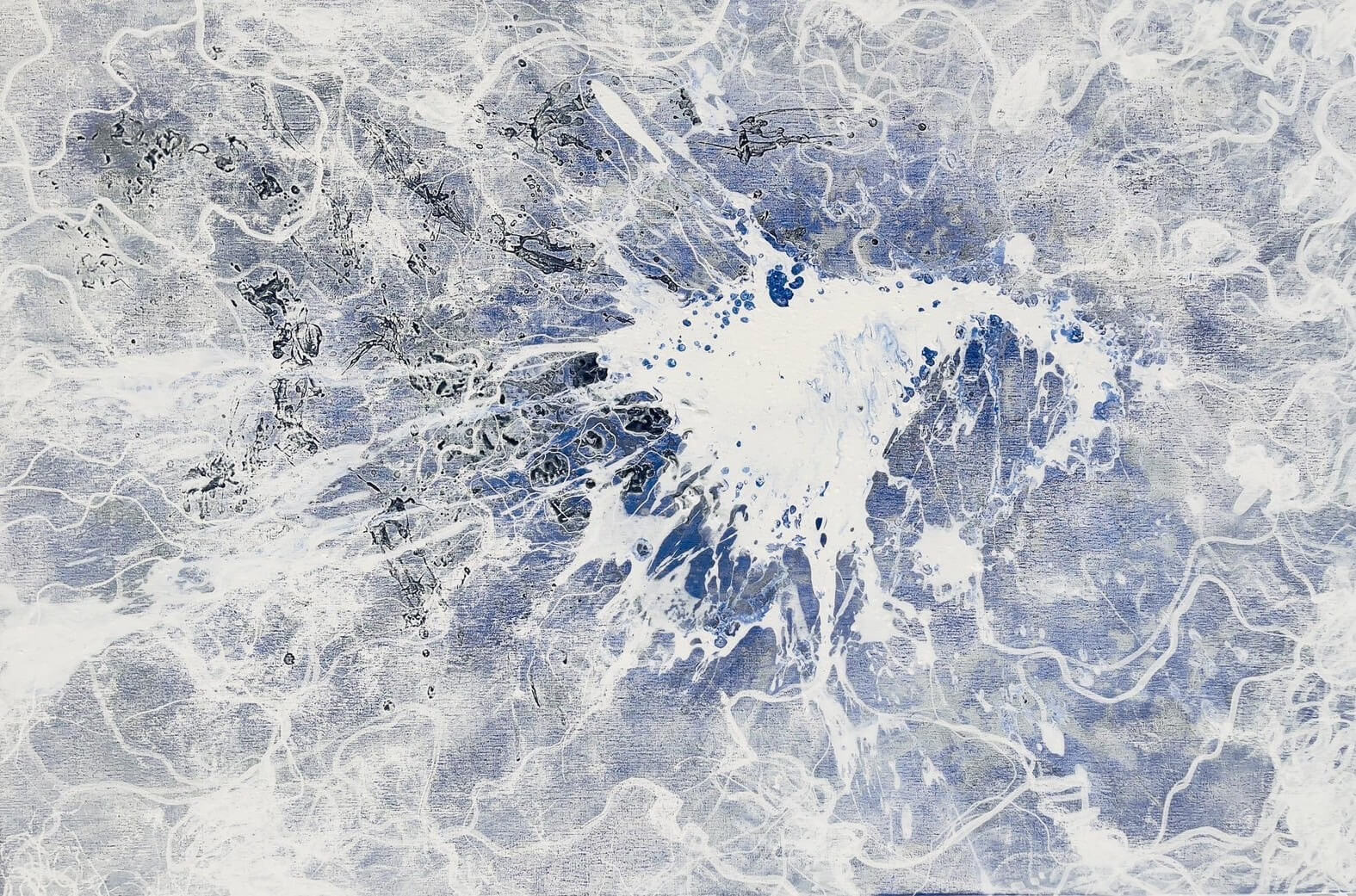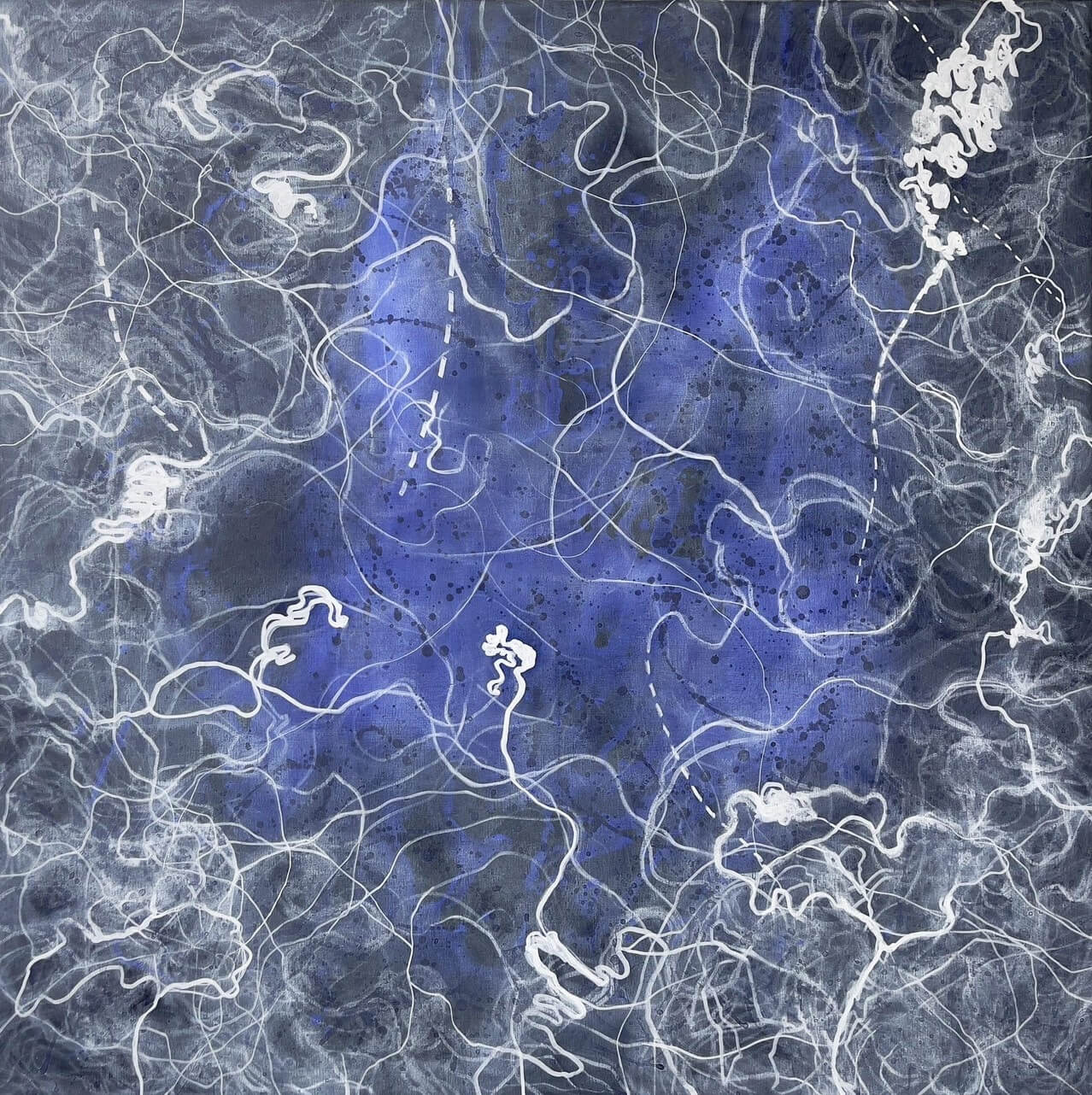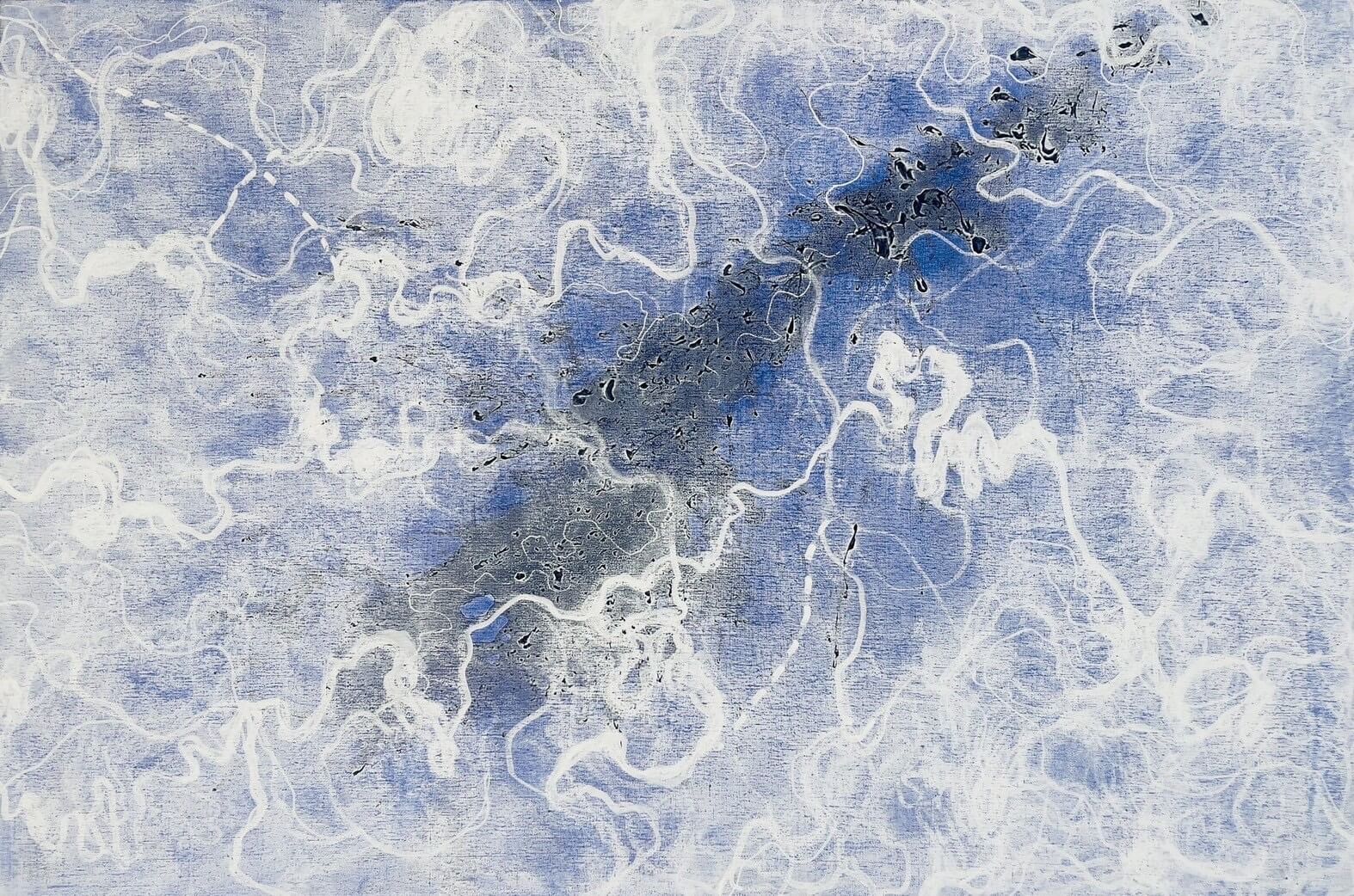 陳美岑此次發表的「Into the blue」、「Rhizome」兩個系列,皆有非常強烈的漫遊、蔓延意象。浸潤畫面全域的藍,以幽微變化的多層次色調創造了空間的維度,並賦予了時間流動的影跡。作品中帶著動勢的線條彷彿自生觸角,它們自由擴張,不被邊界所框架,不為畫面空間所侷限。兩個系列皆感性且直觀地展現了創作者對藝術尋路人生的動態思考,含納其對自身記憶的回望、對寰宇世界及大地生態的觀察、對個人生命軌跡的梳理與再建構。不同的是,兩者採取了相異的繪畫表現形式,開展出各自衍異的心境敘事視角。