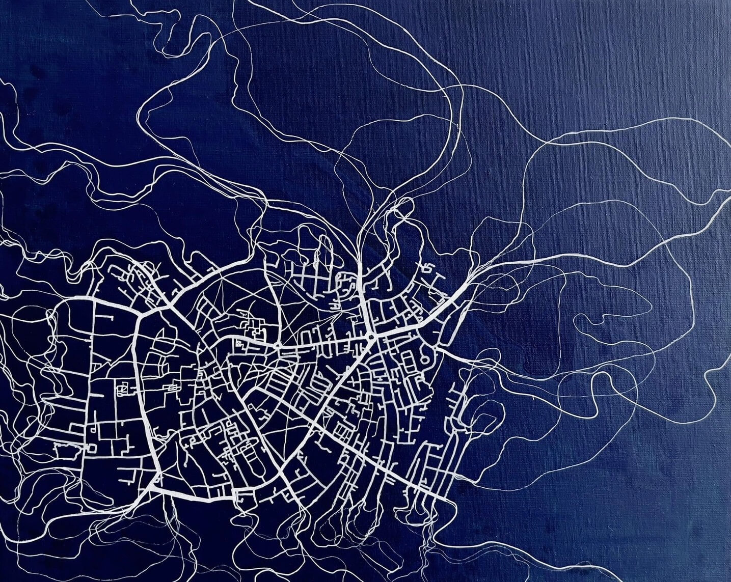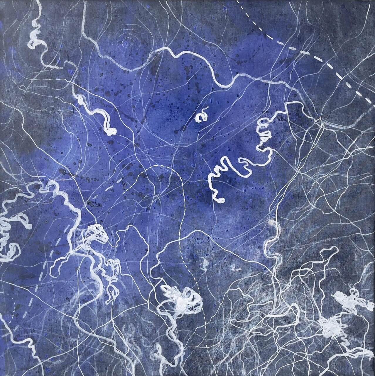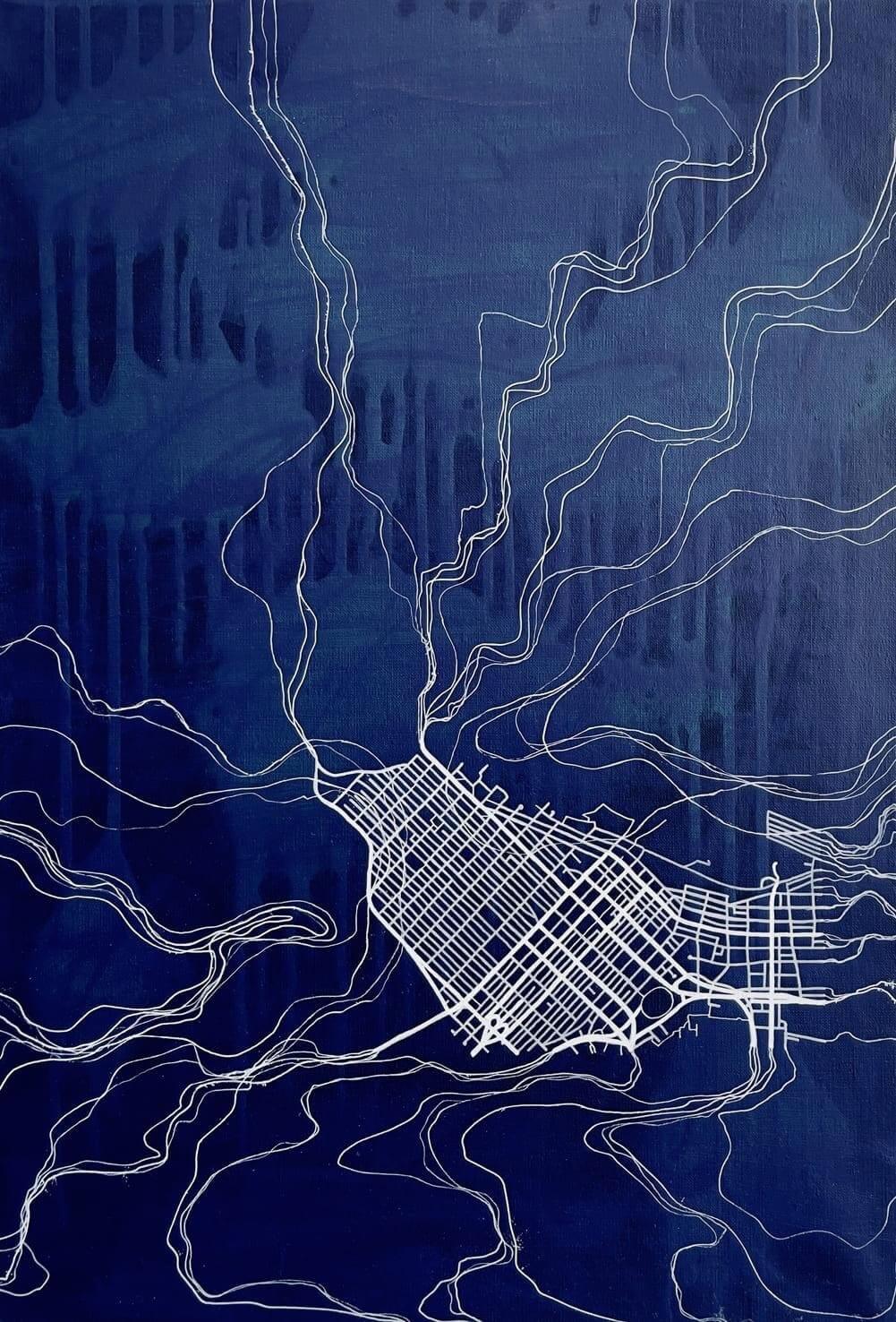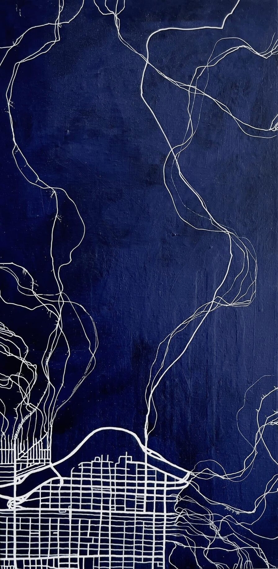 「Into the blue」系列,直白呈現「行旅」之於陳美岑的意義與特殊性,具有濃濃的自傳性意味。此系列不僅註記了創作者於各個城市間的移動行跡,也是她將行旅記憶再脈絡化後,一個重新審視並編織自身創作敘事的過程。作品畫面去除了所有的雜質及不需要的元素,以簡潔凝練、只留下片段道路的地圖意象,去追索與再現關於她對每個地方的記憶與想像。藝術家以創作原欲為原點,未曾止步其探索的步伐。不同的城市、相異的地方,化身為她生命藍圖中不可或缺的因子,相互鋪陳出從之前、到現在、乃至與未來的聯繫,隨著她未曾自我設限的人生行腳,可以自由地、持續地外溢、綿延與擴張。