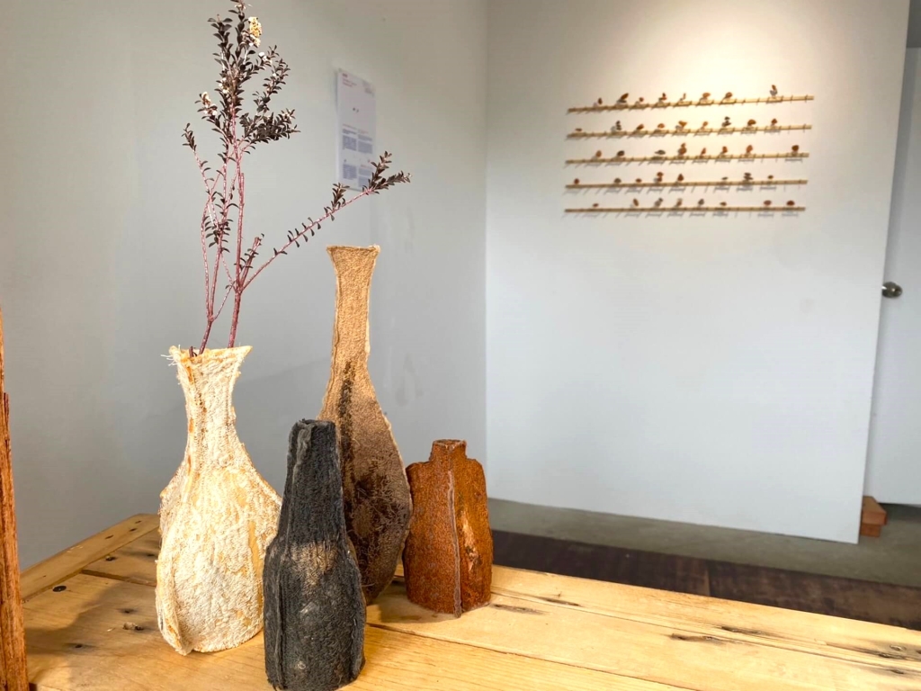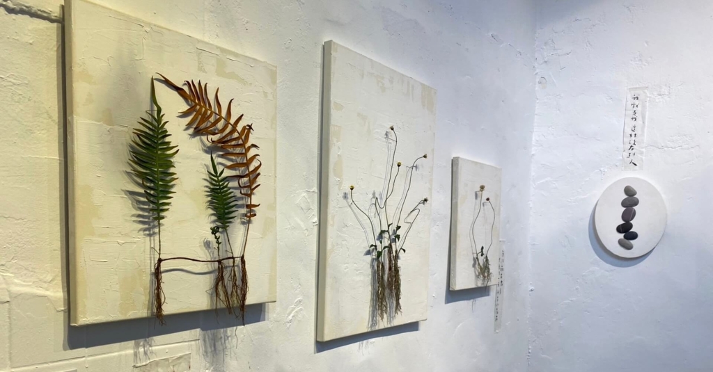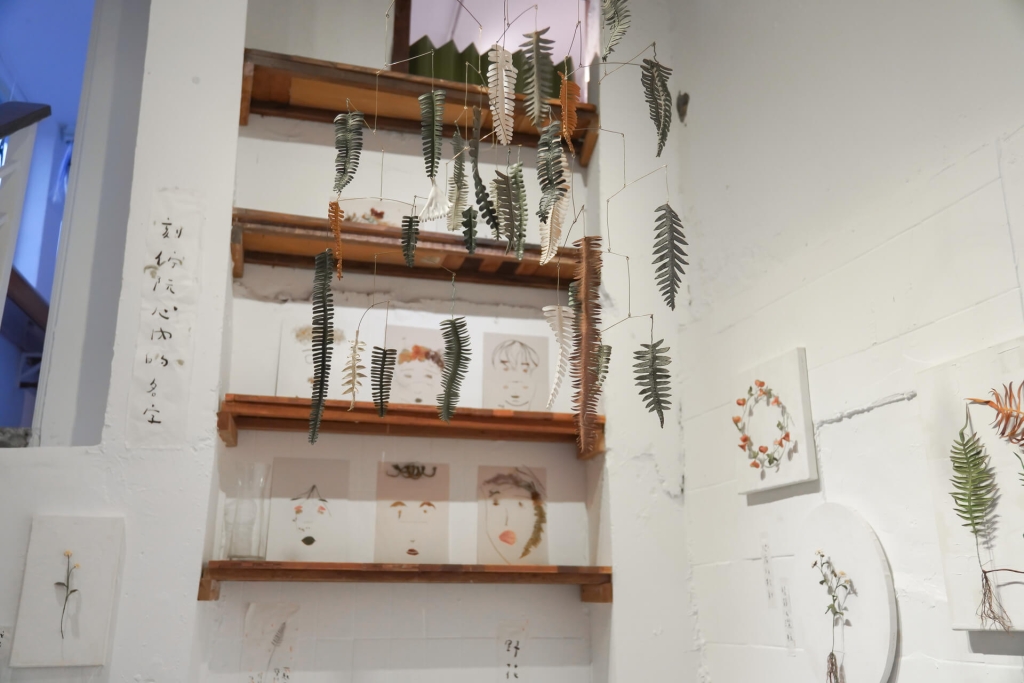 轉角2號展區,由四組藝術家共同創作展示。一樓展間由嬤嬤(murmur)帶來一系列以「刻佇阮心內的名字」為題的皮件創作。嬤嬤的創辦人Ai和Yen的靈感源於自然與植物,藝術家透過細緻的觀察捕捉花草的生命力,以植鞣皮革為媒材,運用手工剪裁、染色、塑形工序等技法,復刻日常生活路邊常見但容易忽略的野生花草,乍看下彷彿乾燥花草般真實的仿生植物。皮製花草以支釘凌架於畫布上,畫布斑駁的白色顏料與展間的白灰牆相呼應,光線照映在植物上產生的光影線條,不但增添了作品的立體感與空間深度,也帶出虛實交錯的通透趣味,營造出慢活、率性的生活氛圍。