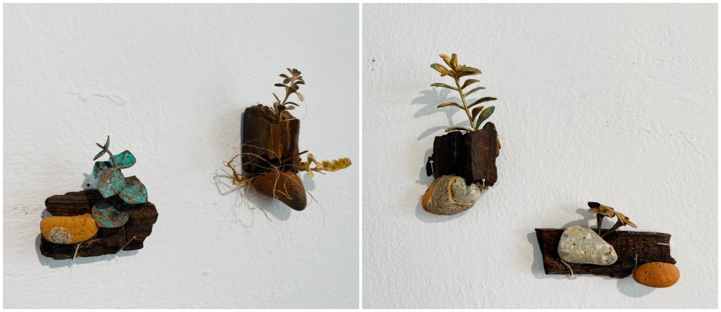 在相鄰的展間內,17做作工作室(17 Work Studio)帶來「寶藏顏」系列創作,藝術家朱淑宛洞察隱藏於村內環境的顏色,採集村內各類植物萃取染液與纖維,運用於刺繡染布作品。同時,以金工鑄造小巧的野生植物,有如披上金色陽光般閃耀,結合拾撿的廢棄磚石、木板等複合媒材,將寶藏巖角落風景巧妙地濃縮進每件作品之中,傳遞屬於寶藏「顏」的色彩與樣貌。