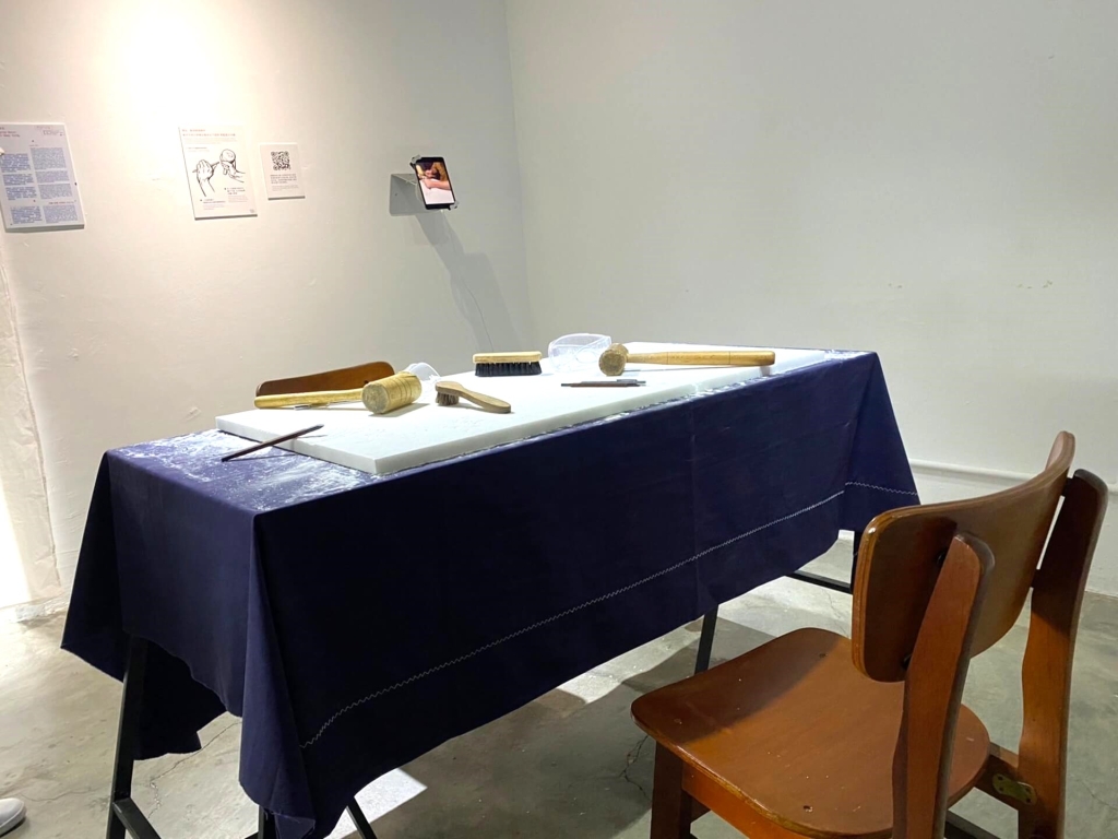 二樓內側展間傳來一陣陣敲打聲,多磨工作室(DUOMUO Atelier)以「滴水穿石」計畫,緊扣「慢」字抽象概念。走入展間,一塊大理石板被平放在桌面上,鑿刀與木槌等工具無序地靜置其上。身為礦石首飾創作者的Pei和Elias,希望觀眾可以透過動手鑿石創作來體會「慢」,體驗創作者切磨石頭曠日費時,必須慢下來、靜下心的心理狀態。兩人在石板上鑿出一圈圈的漣漪作為起點,向外擴散的波紋等待來者持續漫延展開。