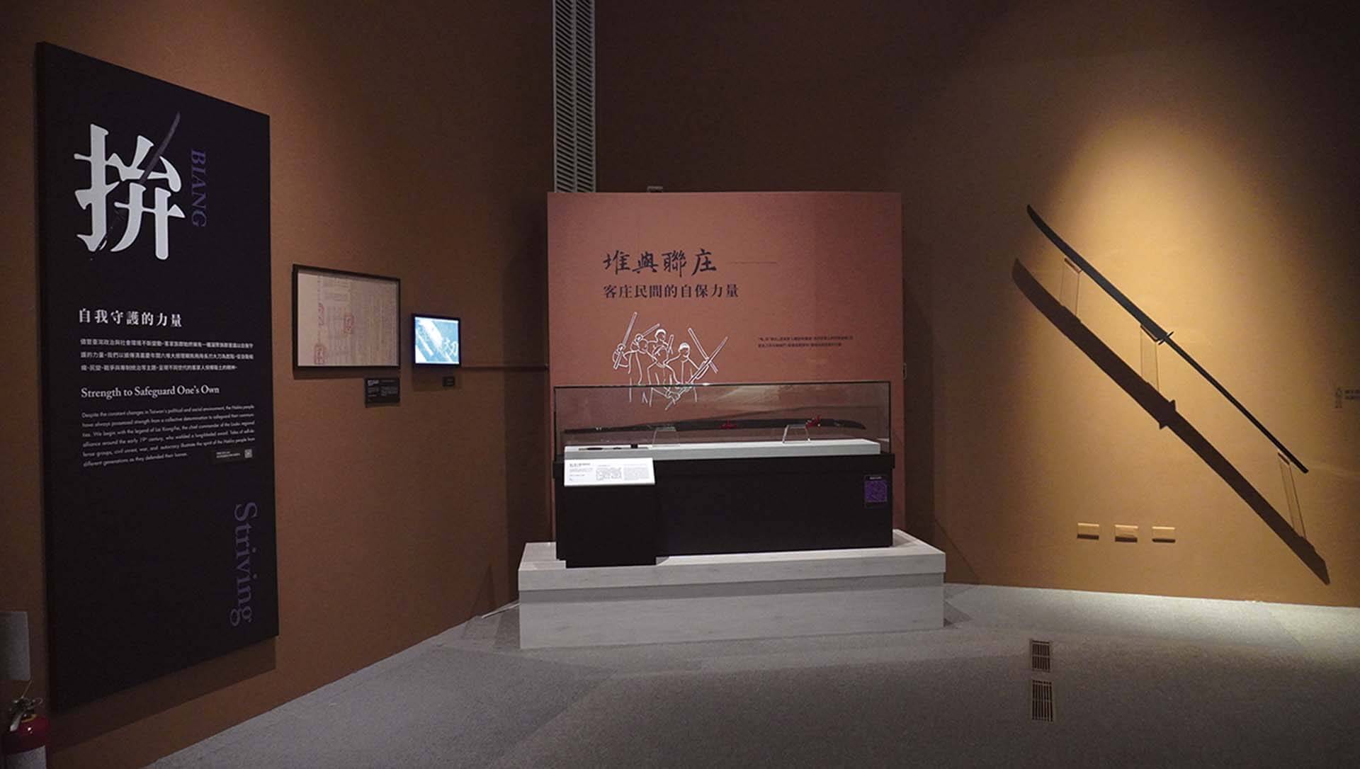 武藝則展現客家族群團結而自我守護的一面,從客庄自保、到後發展為信仰的清代義民、再到抵禦殖民統治的抗爭,集結於「拚」的主題下。相當醒目的展品包括高屏地區自康熙年間逐漸形成的客庄自衛組織「六堆」,其第四任大總理賴熊飛所使用的長刃大刀,見證客家義軍參與抵抗日本殖民統治抗爭的「臺灣民主國」藍地黃虎旗,以及1973年世界客屬總會第二次懇親大會時發行的、印有被視為抗日典範的丘逢甲肖像之中華民國郵票,跨越策展「同心圓」的不同層次。