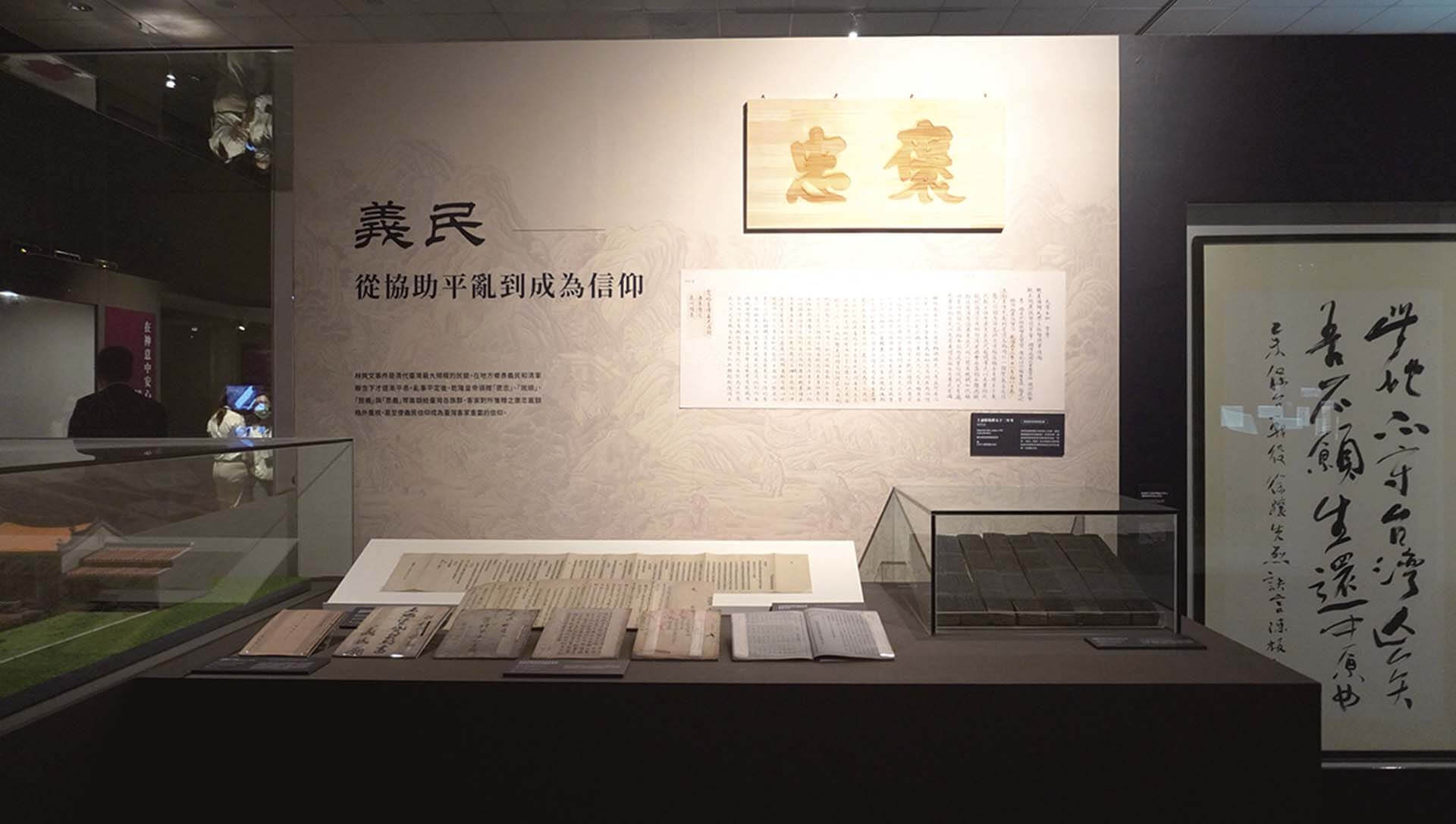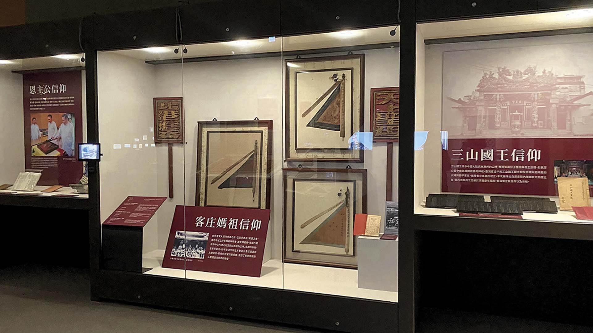 文與武的穿插呼應,共同構成展覽所欲描繪的「臺灣客家人」之樣貌。「敬」之主題中表現的傳統信仰文物及其工藝,是客家文化大眾推廣中少有鋪陳的一個面向,此次展覽觸及臺灣客庄包含媽祖、三山國王、恩主公在內的傳統信仰,囊括一些難得一見的展品,例如若干面由北港朝天宮所藏的進香旗,其中有一面清代道光年間的北港朝天宮進香旗為雲林縣定古物,是目前國內經文資法定登錄現存已知年代最早的進香旗,也是第一次公開展出,從中可見新竹地區客庄人士,在清領時期就已跋涉至遠及百公里以上的雲林北港朝天宮進香。真正的族群遷移也有所體現,如黑色旗面的花蓮縣富里鄉竹田村義民亭香旗,為計畫性拓墾東臺灣的日治時期,桃竹苗等地的客家人攜帶義民爺香火移居東部的歷史見證。