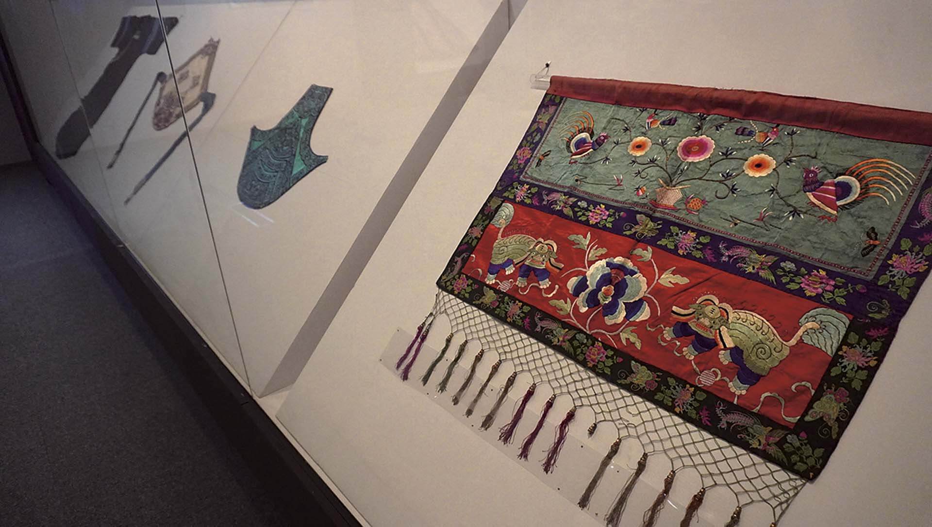 隨後的子題「靚」聚焦花布以外的生活美學製品,從客發中心典藏的南臺灣佳冬蕭家的華麗嫁衣,到來自私人收藏(陳達明、葉國平等)的精湛刺繡及家飾工藝品,家飾美學中也可窺見族群互動的日常,視角也從大歷史轉入族群內部。展品選件明顯依敘事主軸而展開,例如同時對照展出了國立臺灣史前文化博物館提供的東部阿美族上衣「tkpaan」,從材質和剪裁、圖紋設計樣式等窺見當時比鄰而居的客家人與原民族群之間的互動往來。