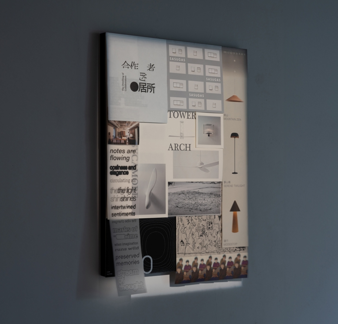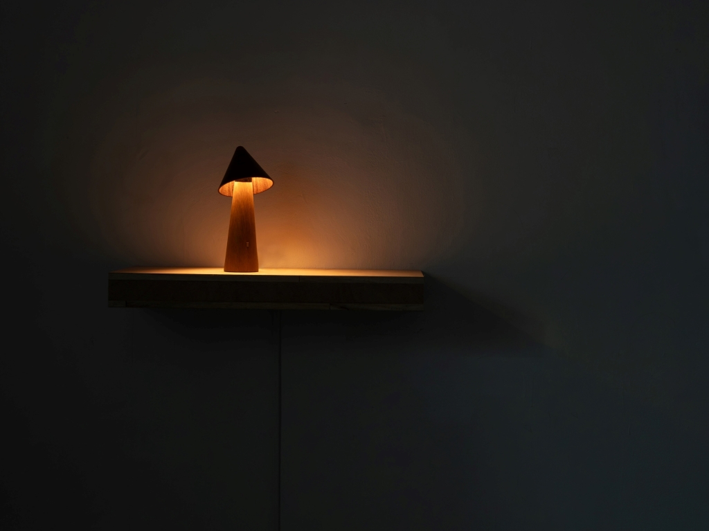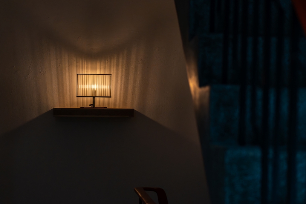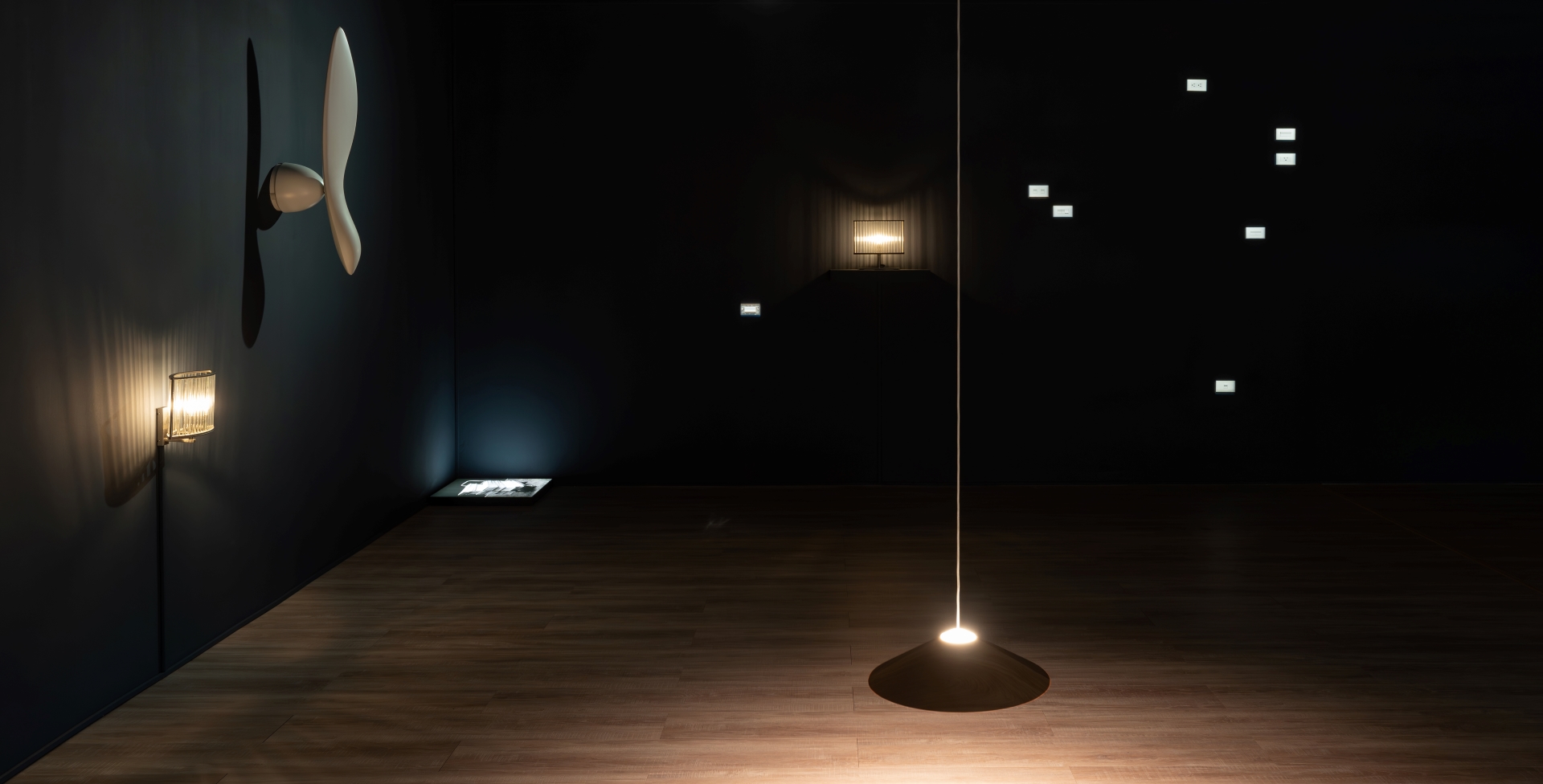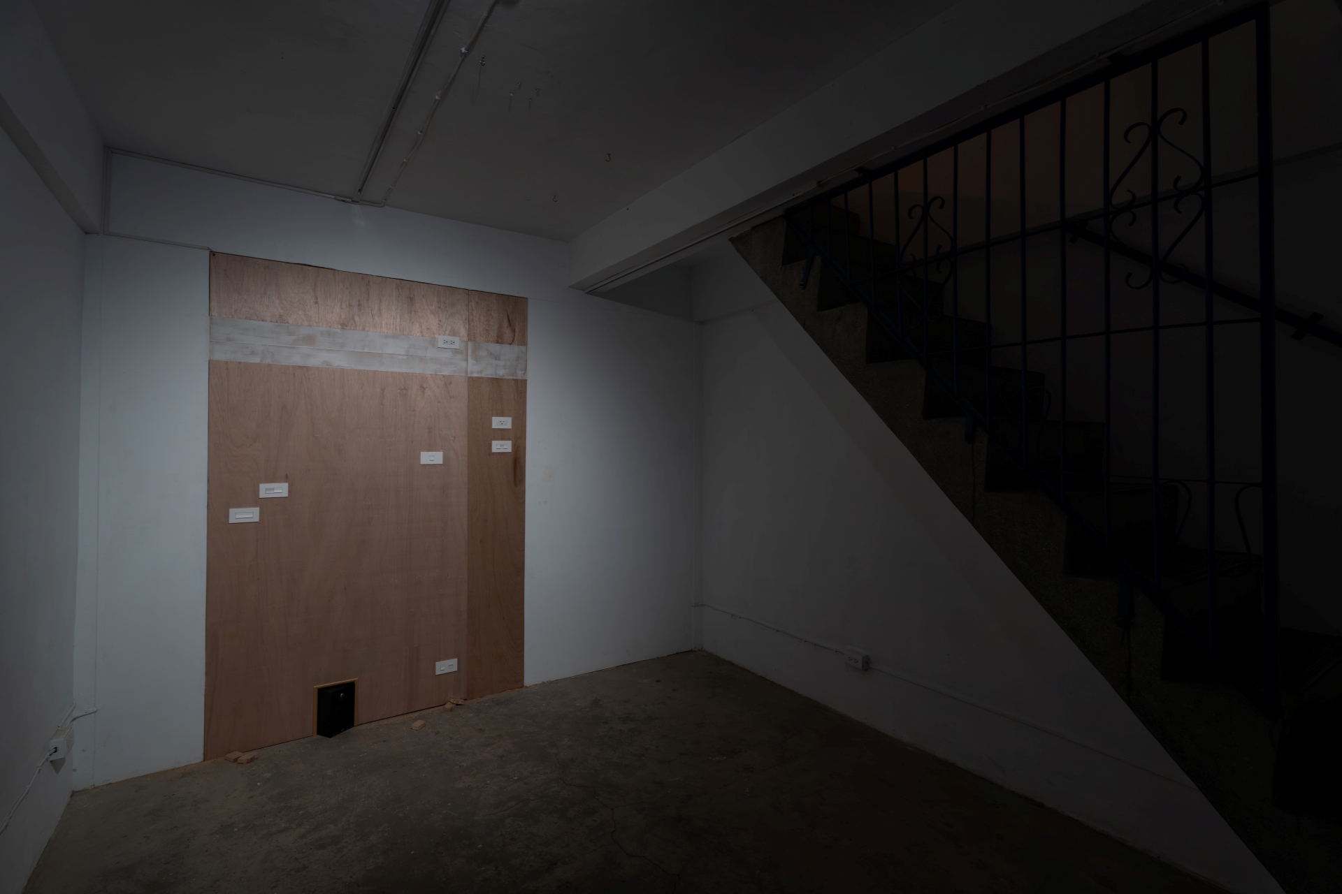 牆面上鎖著其中一個合作者品牌所提供的燈飾,氤氳照亮展間,而不加以打磨的鋸痕與毛邊指向展覽生產的勞動者木工。另一邊則有一扇白色的電扇,其特殊的造形,脫離電扇的功能,而成為雕塑立於牆面上。空氣中繚繞低緩的音樂,來自於另一個合作者樂團「布萊梅」的專輯《Taured 陶樂德》,講述一個邊緣島國的故事,以此歡迎踏入這個「藝術世界」的觀眾。順著音樂來源,抵達地下一樓,也可以見到如一樓展示手法的牆面,沒有打磨與上漆的木心板,並且鑲嵌七個開關。其中一個開關控制著展燈,隱喻展覽中合作者彼此相依連結的狀態。