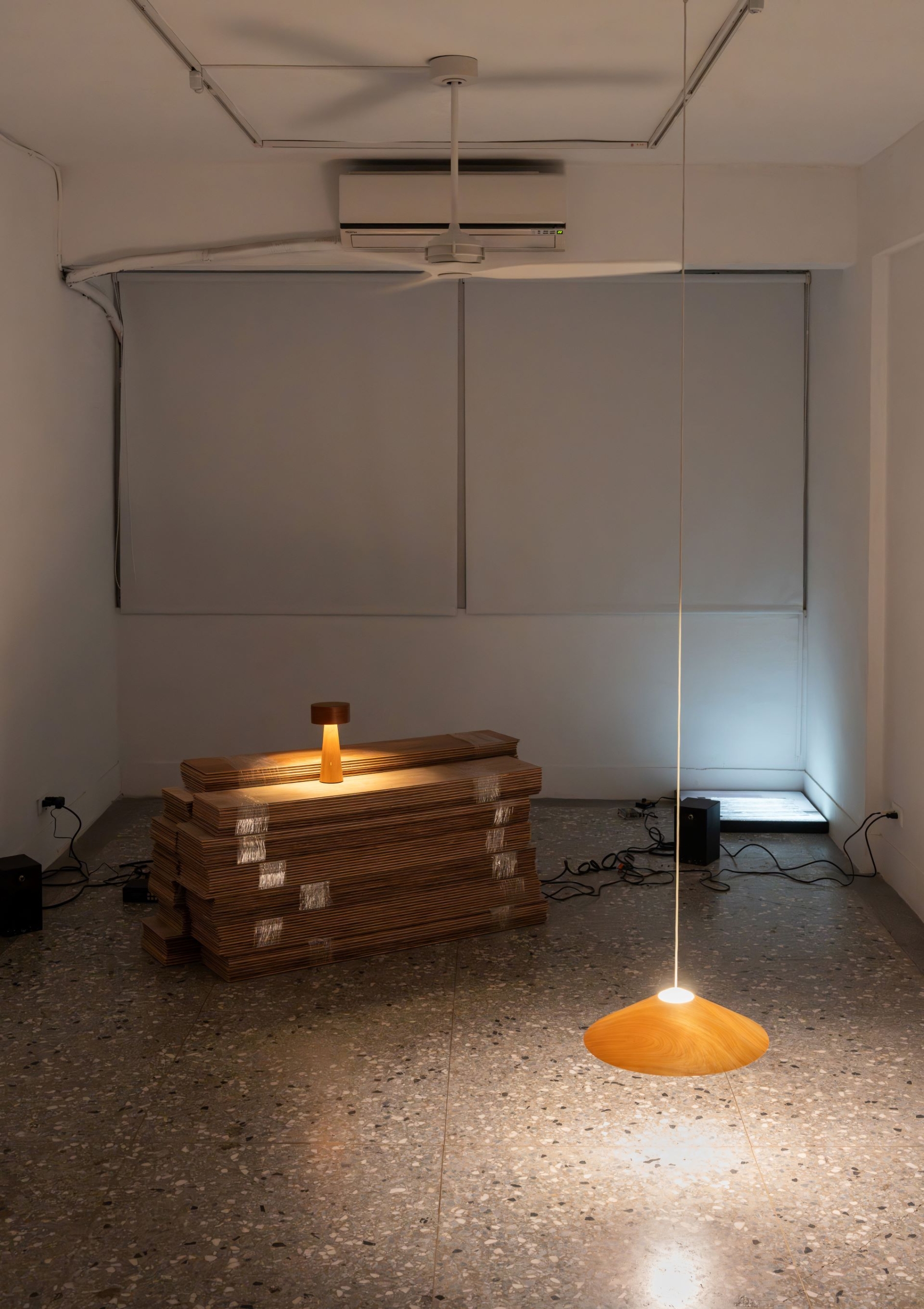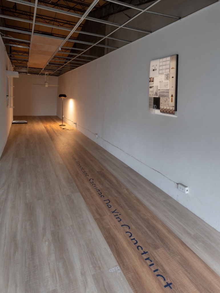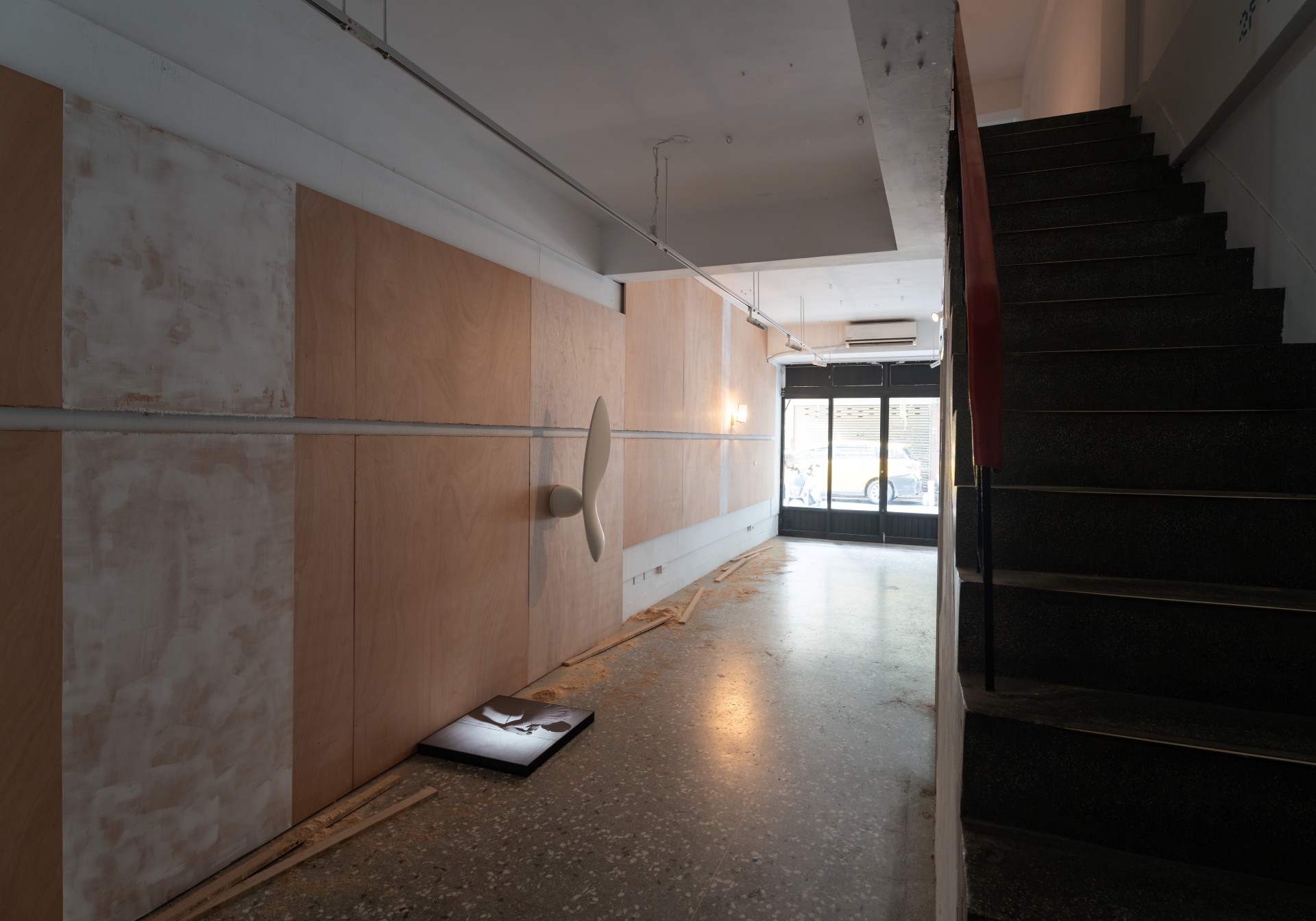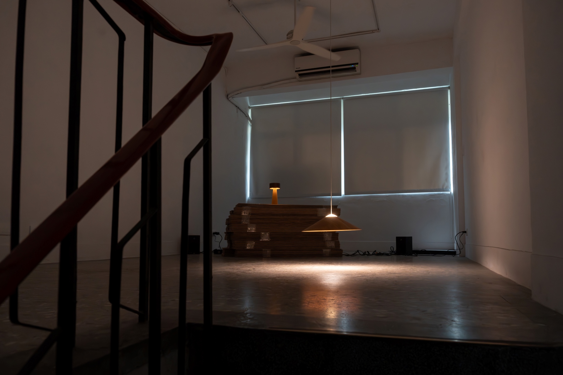 來到二樓則是可以見到一頂接近地面、照亮磨石子地的吊燈,其後則堆積著好幾壘的木地板片,以及上面所放置的一盞蘑菇檯燈。這些木地板是施作過程中所暫時堆放而成,並隨著布展進度的推進而逐漸減少,最終成為一踏木板。也是展覽的流動過程中,明示時間所產生的淤積擱淺於此。天花板上懸吊著白色的電扇,與逐漸彭湃的「布萊梅」音樂節奏相呼應、緩緩轉動。在木地板片之後,地面上也如同一樓放置一面燈箱影像,並且繾捲著電線。