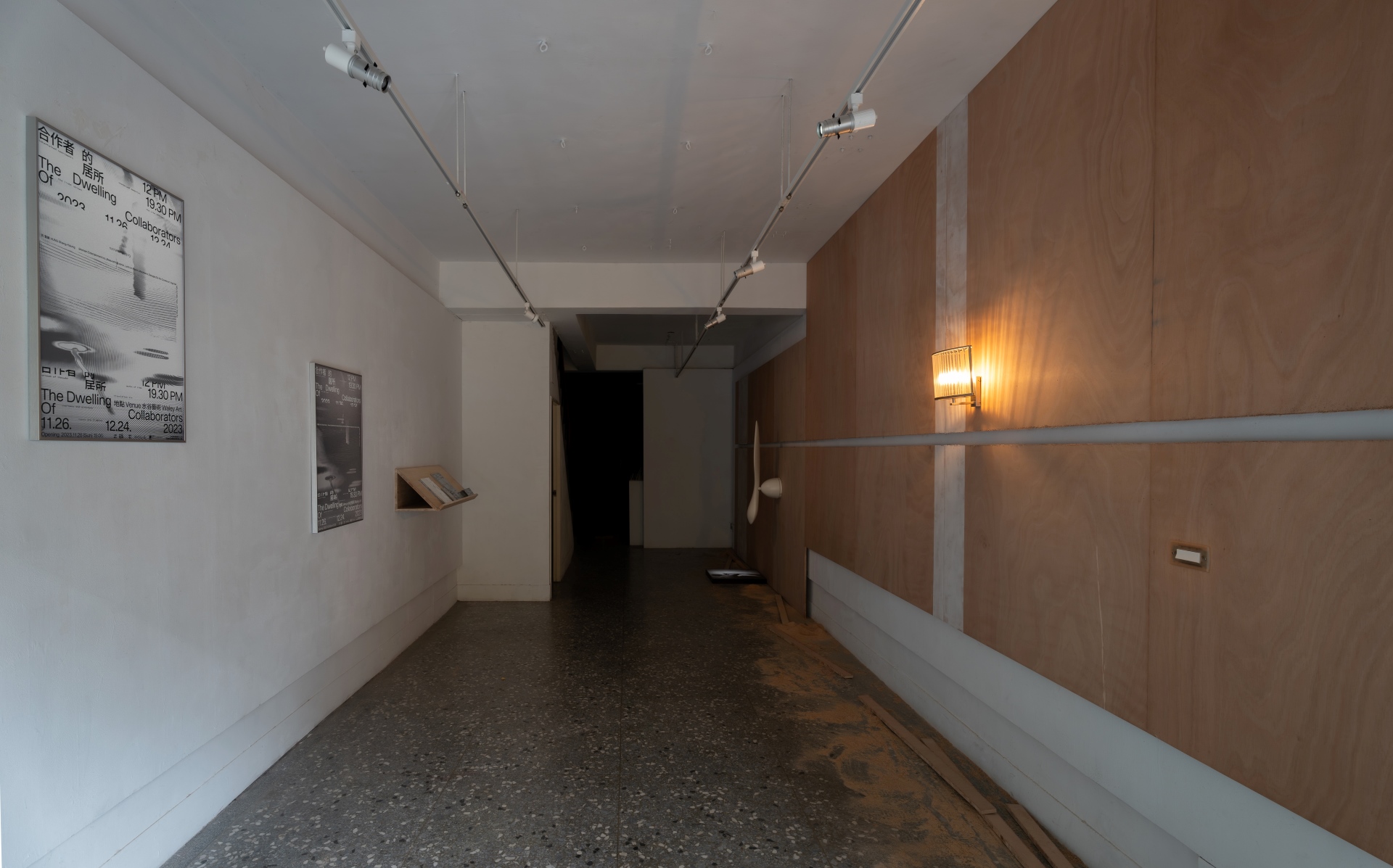首先,關於「合作者」所指的是在當代藝術的創作生產的過程中,所需要的策略與勞動結構,也就是在藝術世界中,共同合作構築作品的工作者。洪聖雄以作品、展覽的「編導」角度切入,找尋10個不同工作者,展示彼此參與展覽的結構模式。在甫進入展場,可以見到展牆左面與設計師王昱惟合作的海報,一黑一白的展示,暗示展覽所揭露藝術世界的另一面。另一面牆則以木板包覆,這種木心板常見於展場的牆面製作,且展牆中間鋸開一條約六公分寬的縫隙。牆面也有兩道十字交錯的淺淺批土,以繪畫性的手法底定整個展覽的詩性節奏。地面上則散落角料、木屑,以及一面燈箱,展示攝影師劉薳粲所拍攝施工時的影像,則是指向了藝術世界的「生產」過程。