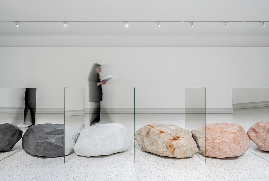 文心藝所的現代空間具極簡風格,素雅大方。佈上純白色展場,矗立著柯維德的奇特作品。而每顆石頭,再以雙面鏡隔開,鏡面的反射效果明顯,讓空間無限延伸。柯維德的創作語彙,圍繞著真假虛實,從鏡子中看到的石頭透過鏡像轉換將不再是石頭,而只是看似像石頭的象徵,觀者不再把焦點放在石頭本身,反而是鏡中的反射聯想。這種「看山不是山,看水不是水」的語境,成為是似而非的辯證,特別迷人。