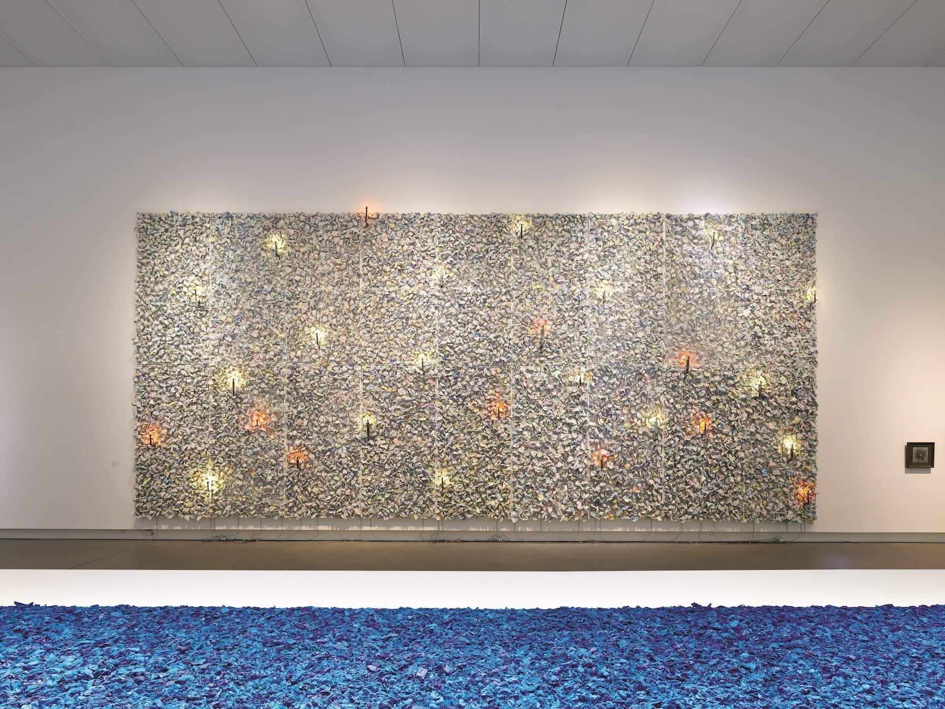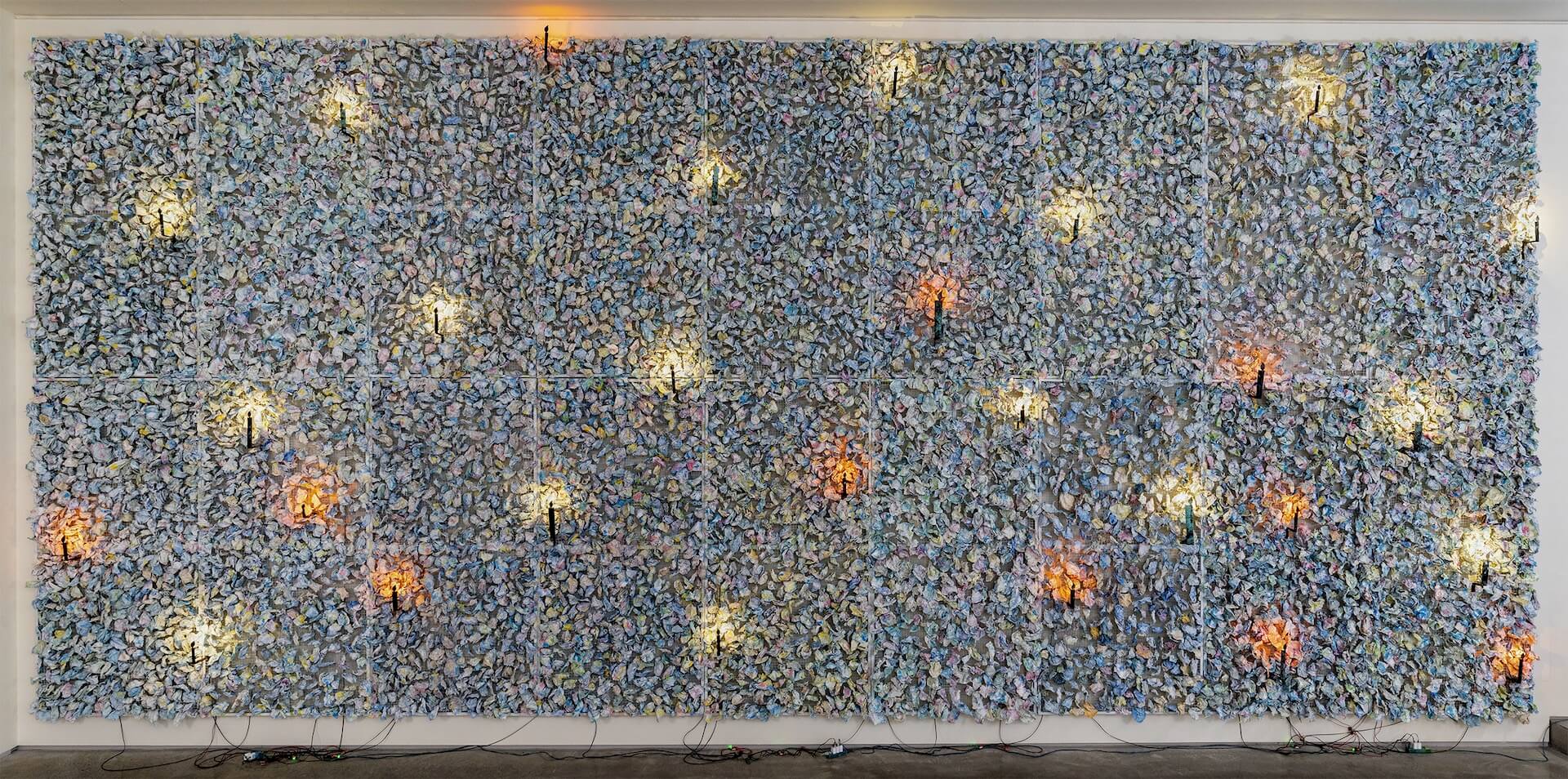 初看《百年廟23-00》這幅大作,第一秒先是放空,之後思緒紛然湧現。它由成千上萬個灰色紙團所構成,紙團濃密軟硬有別,且各顯顏彩,大致維持在灰階的頻率,構成一種整體。