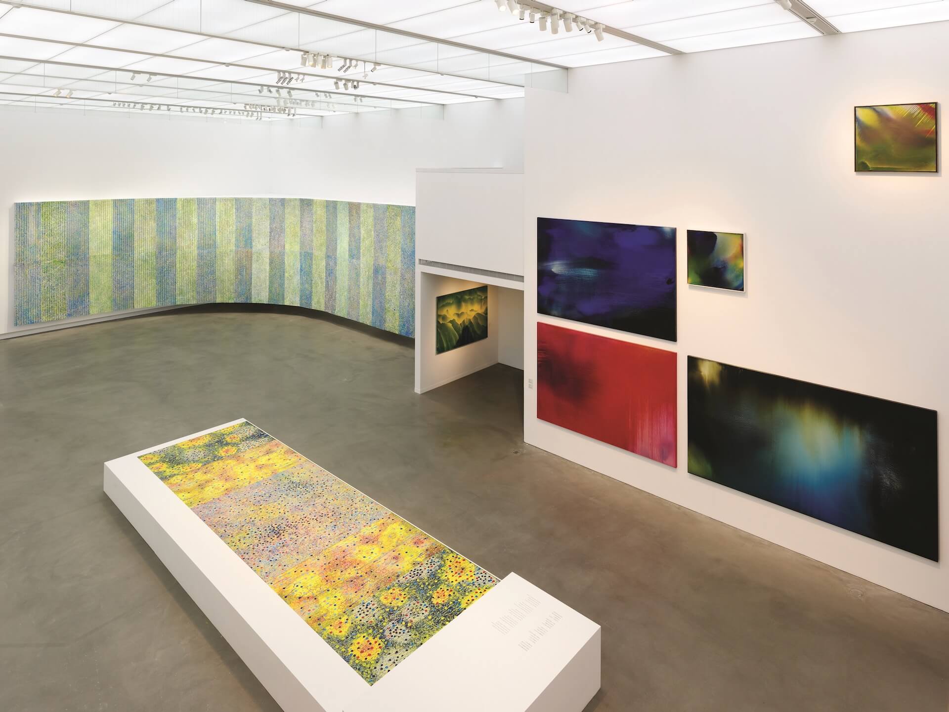 這次展覽挑高的展廳中,弧形的《牧神的午後23-00》是由四十六張半透明塑膠浪板組成,江賢二以墨點式潑灑出層層疊疊色彩,光在其間透析、交映、渲染,十足浪漫。江賢二回想著,有次颱風前夕,他站在台東住家高處,望向前方無垠的太平洋,遠處蘊蓄著的劇烈風雨,他吹著狂風,滿滿襟懷地感受著,「那遠方的濕氣,海面朦朦朧朧的藍灰,四週的綠意,以及鼻腔裡涼涼的空氣,真像我第一次看到這件作品的感覺。」