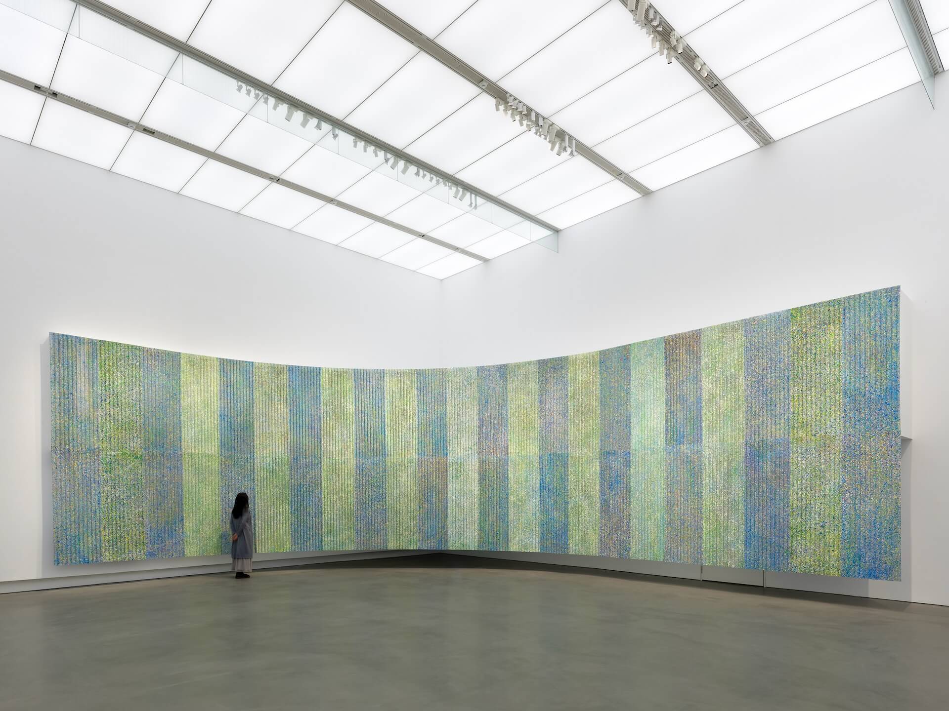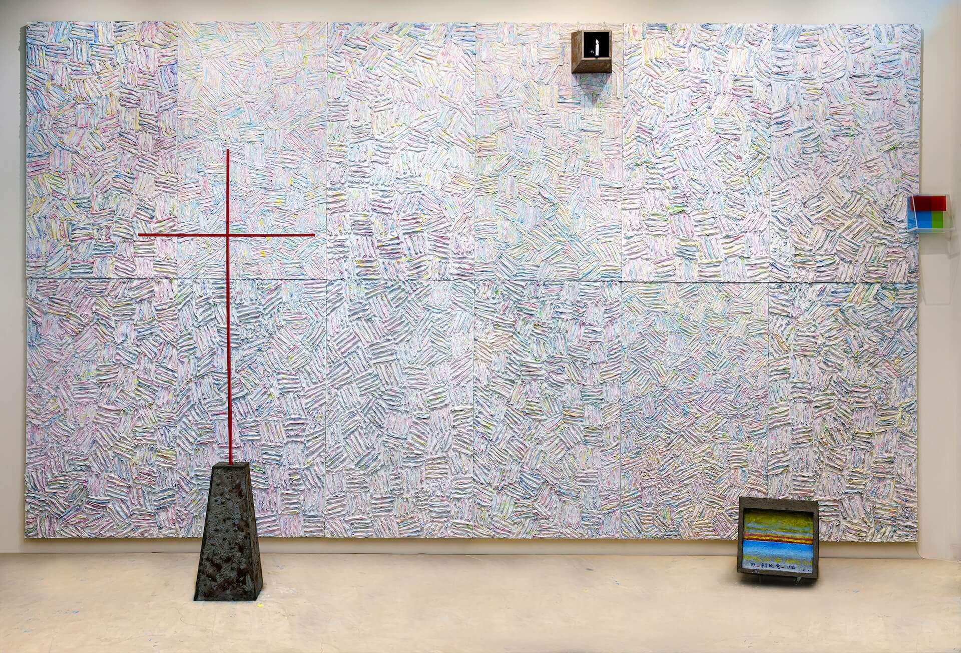 江賢二一直對神聖空間,有著無比的嚮往,總是留連於教堂、廟宇。《廊香教堂-向柯比意致敬23-00》是以紙質為基底的大作,但肌理質感與《百年廟》相異。江賢二刻意將紙揉成條狀,反覆加厚添實,再以上下左右條狀紋理,構成作品本質。他以這些多重方向的紙條,擬仿筆刷沾滿厚重顏料的上色效果,從紙裡隱隱約約透顯出薄暮般淡彩,遠遠望去閃現出珍珠貝母的七彩光澤。