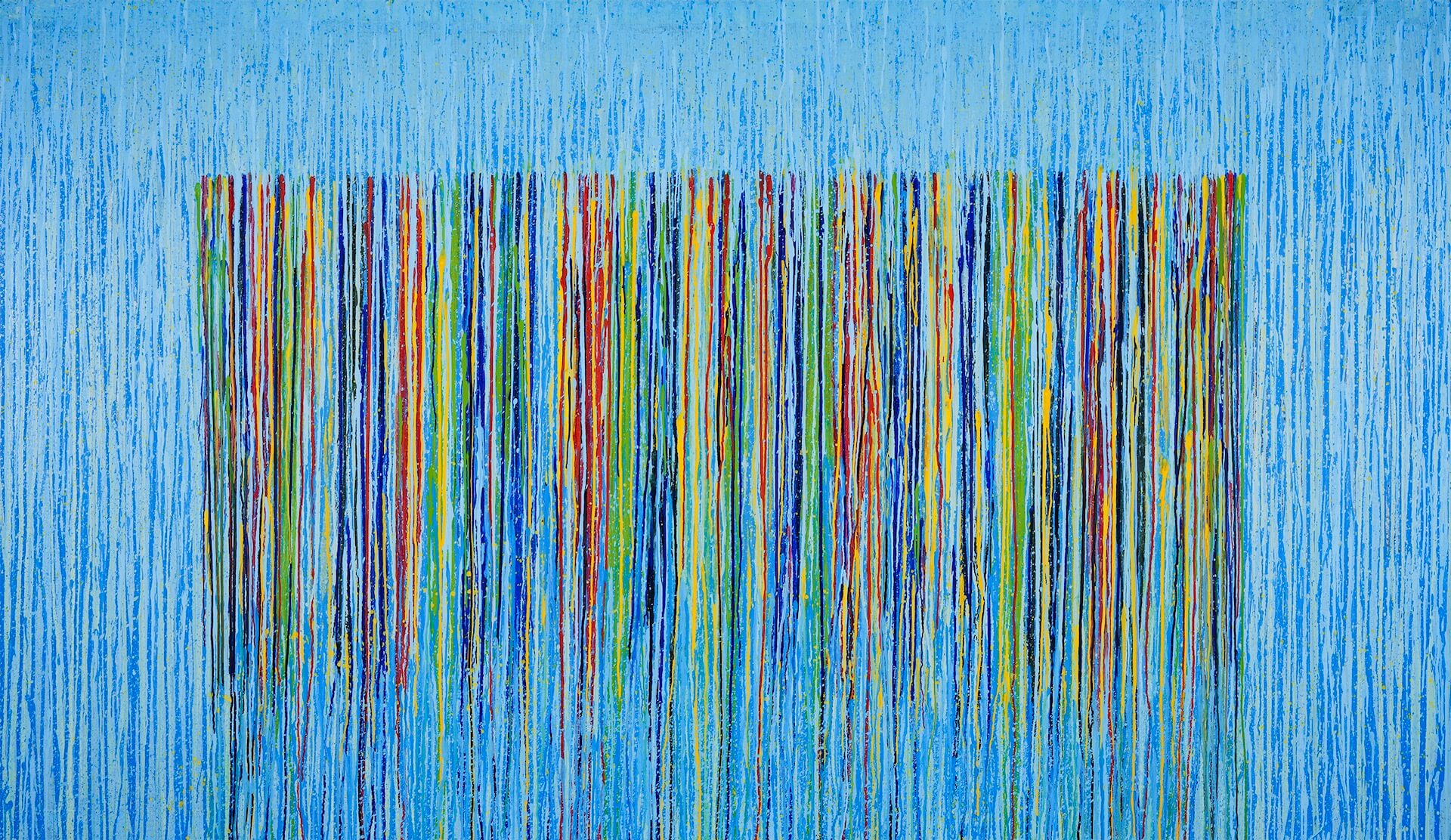 他以自己眷愛的法國作曲家德布西(Claude Debussy)《牧神的午後前奏曲》(Prélude à l’après-midi d’un faune)為此作命名。同系列另一幅《牧神的午後23-07》,畫面中交纏著各種顏彩之間細針密縷的詩意,像是午後忽然降臨的一場彩虹雨,那一道道遺留於窗玻璃上水痕,像是牧神寫給寧芙的情詩,字裡行間,訴說著淋漓奔放的熱情,以及悵然若失的思念。