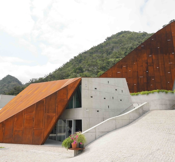 這件寬幅七公尺的《廊香教堂》從牆面一直延伸至地面,再連接最前方的十字架,與建築大師柯比意(Le Corbusier, 1887-1965)的墓碑,整件作品就是向大師致敬。