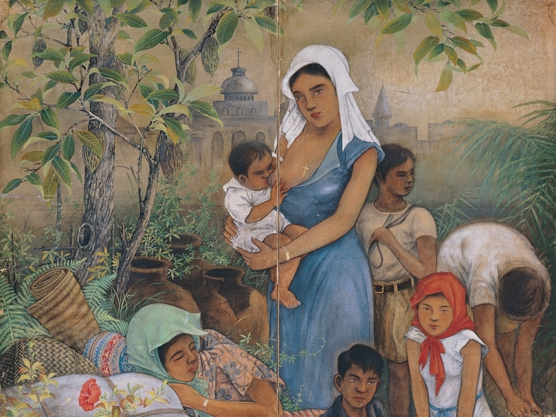 日治時期在台的日本藝術家石原紫山以自身在南洋的參戰經驗所繪製的《達魯拉克的難民(比島作戰從軍紀念)》。(臺北市立美術館提供)