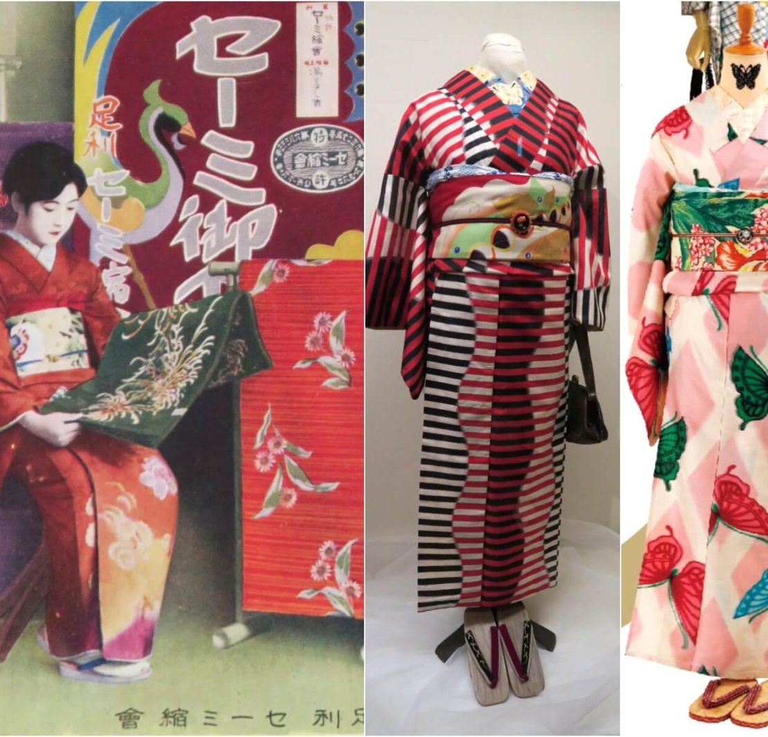 然而,時尚加入現代藝術的元素並非僅止於歐洲設計師的致敬。在日本,追求時尚風格的少女們甚至將現代藝術融入日常穿著,成為一時流行。雖然過往的「現代」如今已然成為「復古」,但依舊吸引一批支持者努力維繫、相互交流。這種時尚便是在第二次世界大戰以前日本頗為常見的「銘仙」和服。