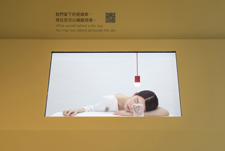 在他們中間,謝佑承與李明學顯然將互動的概念推向一個橋接了實體與虛擬空間的新突破口:前者在實體展廳內設計了需要觀眾在線操控的照明系統,身體在場與網際操作缺一不可(《校準:藍幕》/《藍幕》);後者則同時在線上、線下兩個版本中分別完整演繹「在有另一個他者存在/在線時,才能『看見』」的哲思(《遙望的空洞》)。這樣作用於觀者能動性的若干互動性操作,成為觀眾走入這次展覽實體空間後,可直接體驗到的為數不多的擾動因素。除此之外,大部分於展廳內存在的是作品的「線索」、「痕跡」。即便如此,一個視覺藝術展覽在實體空間內對美學呈現的根本要求並未因此而抹殺;「給火星人類學家」展讓過去大多展呈繪畫與雕塑等傳統門類藝術的新北市藝文中心以其白盒子的原生樣貌出現,如何將空間本身納入展呈結構,就成為策展工作中不可忽略的部分。何采柔、賴志盛、徐瑞謙與時永駿的作品,分別在狹長的兩個空間中成為穿針引線的視覺線索。有趣的是,張君懿是在藉助720度環景介面而留意到天花板區域後,邀請徐瑞謙利用天花板空間來創作;虛擬介面提供的經驗,流向實體空間、並成為發現和改變的力量。