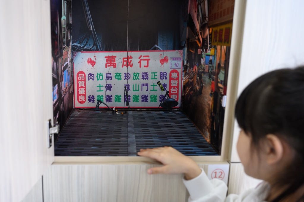 藝術家林怡君的「小社會」系列是此次「外掛學校」展場內最為醒目的一組互動裝置,屬於較為典型的以遊具設計為主的兒童藝術展形式,為兒童提供透過藝術語彚來動手創作的不同類型活動,藉由視覺、聽覺、觸感的美感經驗,引導孩童在實作中既與遊具互動、更與其他人建立種種相互關係,形成一個個微縮的「小社會」。林怡君以八德地區街景輪廓速寫來創造立體積木般的遊具,也用可互動的聲音裝置與光影遊戲打開觀眾的敏感,再以詩意的文字塑造觀眾的想像。