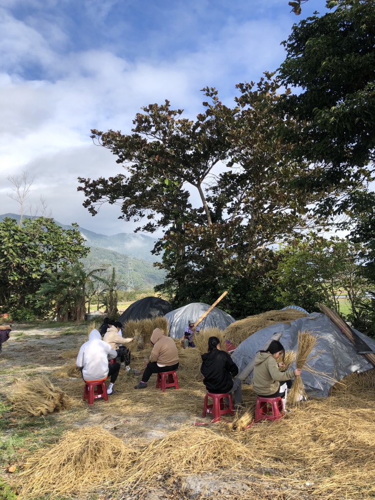 「藝術家駐點」的幾個子計畫,正是具備這樣對多元族群、對過程性探索的意識。盧建銘的「造屋計畫」從部落開始,一路採集花蓮的稻草、桂竹與銀合歡樹幹、桃園的山棕葉、月桃與白茅、高雄的輪傘草,裁切北美松與櫸木細枝,再到桃園的工地學來建築工法,讓部落的手工造屋傳統在都會區移地實現,在「外掛學校」展期間於桃園兒美館的戶外露台上呈現,也呼應了都會原住民落腳桃園的移居脈絡。阿美族部落年齡階層的社會運作模式給他以啟發,在這一計畫中為同年齡層孩子提供分工協作的機會,基隆八斗高中的原住民族實驗教育班、桃園在地國中的共學團孩子們以及部落老人、年輕教師與之合作,從材料到成品的造屋過程,始終在動態中進行。