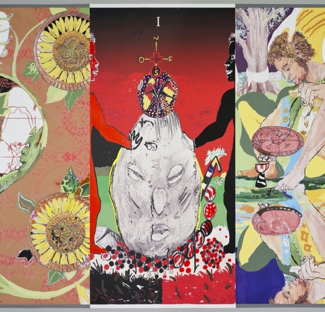 卡洛斯.佛朗哥(Carlos Franco)《Augurio Positivo Elegua Orula》,複合媒材, 300 x 400 cm,2018。(陳氏藝術 Chens Art提供)