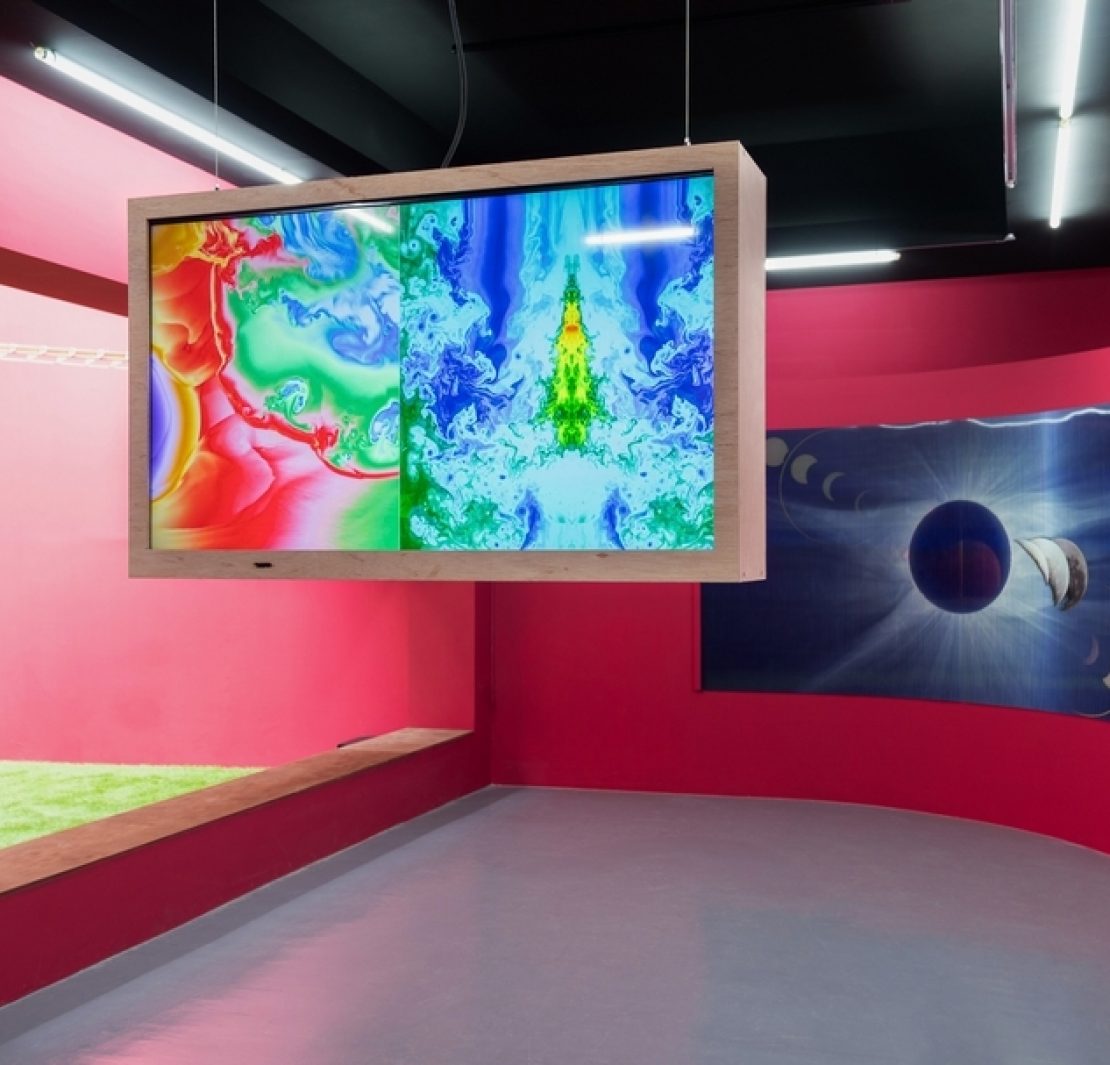 首間展覽場地「九單藝術實踐空間」將常民信仰文化的美麗符號和天文圖像並置,呼應著天問的調性,媽祖神冠前方佇立著成列的龍柱與花鳥柱,在沒有祭典激情的烘托散發著較為中性的莊嚴氛圍,而隔壁展間使天問在視覺上成為可能,天文及天文物理研究的成果呈顯宇宙天體的多樣型態:光柵片重疊著太陽影像與月亮軌跡的攝影;恆星的爆炸模擬在螢屏中發散斑斕色彩。兩者截然不同的知識系統探問天際,無論是作為精神寄託的常民信仰,抑或是公式理論支撐的天文學,皆承載人類夢想接近世界本質的慾望。