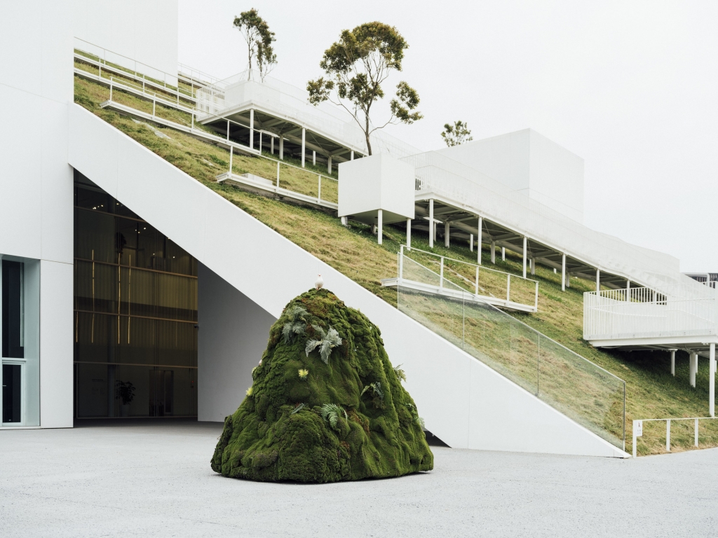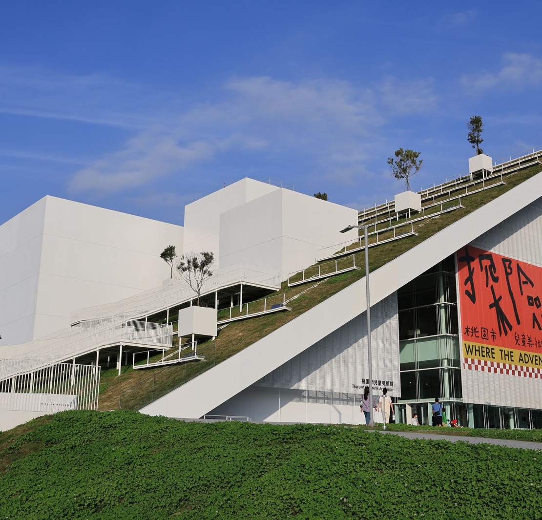 兒美館外部面向青塘池一側有大面積斜坡屋頂與白盒子概念箱型空間,長長的白色Z字型步道可讓人直接拾階而上。山本理顯期待在坡道上奔走的孩子們本身成為風景的一部分,也呼應兒美館的定位。斜坡屋頂也覆有12公分左右的土層,選擇桃園在地植物,形成多元物種自然生長的山丘草坪,同時也成為隔熱的綠屋頂,可節省能源。未來桃美館本館將有六個適合不同年齡層民眾活動的露台,以在設計上創造自由空間為理念。