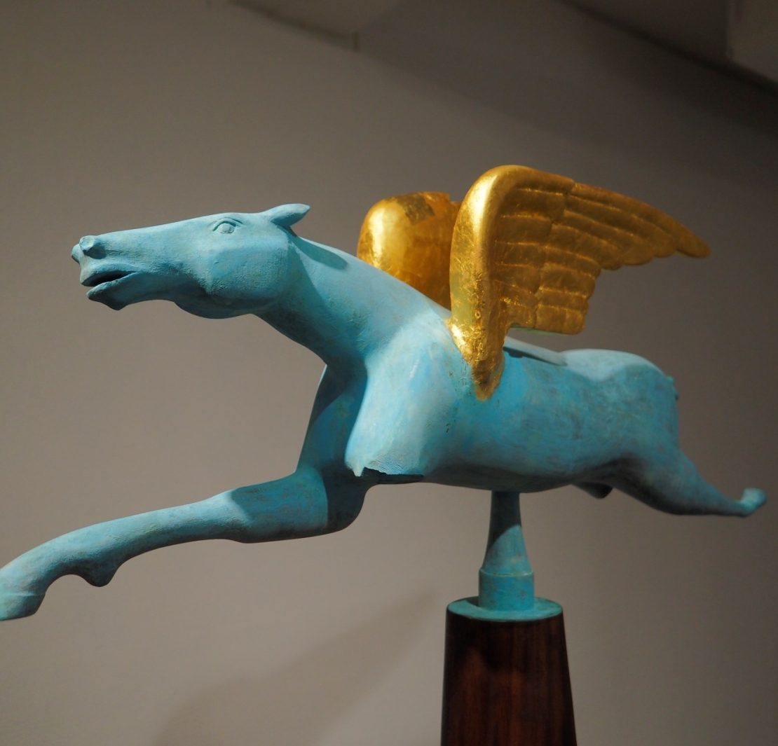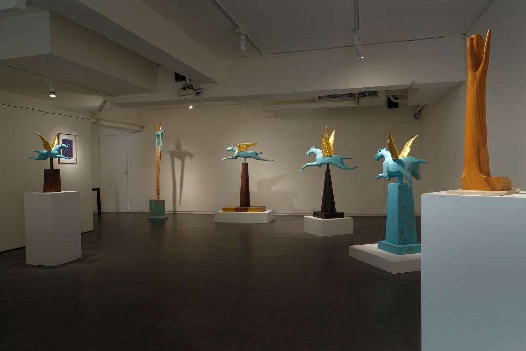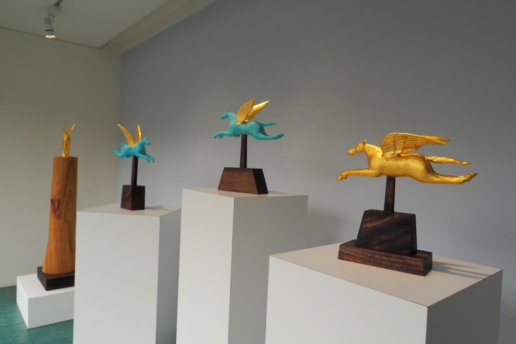 深入展場之後,觀眾會看到一排帶有金色翅膀的天馬,逐一以不同的姿態向前奔起。如同方才所見的天馬般,同樣沒有雕刻出馬的前後蹄,只有舉起的前臂與躍起的後腿跗關節處,儘管未能在視覺上看見「腳蹄」,但是不影響觀看每一件雕塑凌空躍起的模樣。