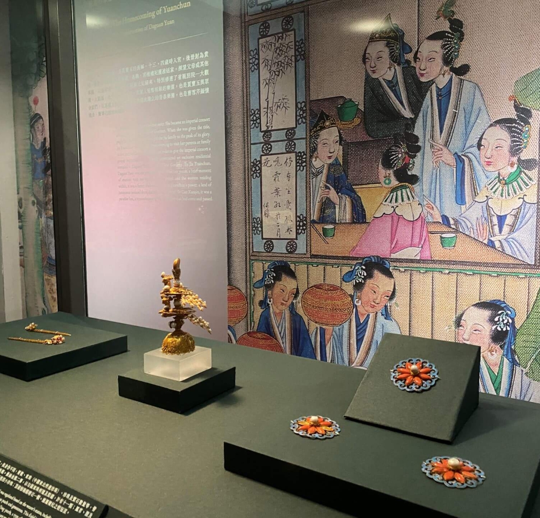 書中賈府四位千金分別名為元春、迎春、探春、惜春,中間字連讀諧音「原應嘆息」,寓意四春薄命,生於賈府末世的命運多舛,是一場本來就讓人嘆息的悲劇。寶玉的長姐元春入宮晉封為貴妃,使賈府的榮耀達到鼎盛,賈府為了迎接元妃回家省親,特別修建了大觀園,成為紅樓夢這齣好戲登場的主舞台。本次展出嬪妃等級的朝冠頂,嬪妃位列貴妃之下,纍絲金鳳二層,鑲嵌東珠和貓睛石,可想見貴妃的冠頂應更奢華富麗。