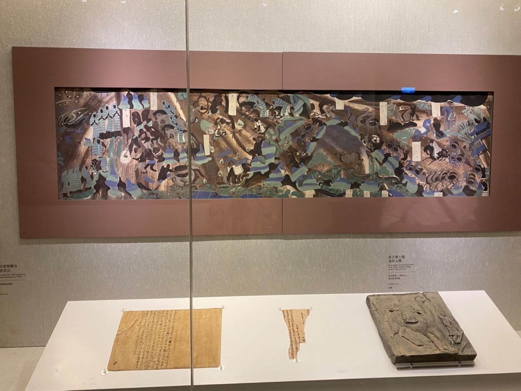 敦煌作為歷朝邊境商貿重要門戶,遺留下的驛站遺址、過所文牒、關吏出入憑證等豐富史料,在本次特展亦有展示。莫高窟第420窟的唐代壁畫中,還保留了當時西域商隊偶遇強盜,因誦念觀音聖號獲救的情節,畫中商隊驚慌無助的生動場景,極可能源於畫師的真實見聞,充滿了藝術感染力。石窟內的壁畫人物皮膚因以「鉛丹」(近似橘紅色)混白色而成,「鉛丹」中的鉛成份,經長年氧化作用下,慢慢演變為深褐或黑色。至今氧化作用仍不斷對敦煌壁畫群造成威脅,因此需要靠專業繪師長年搶救修復,以摹本複刻還原壁畫的原貌神彩。
