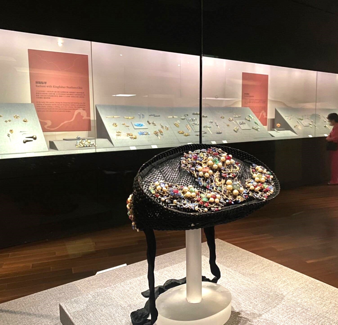 「妙色」指透過物品美好的表象,呈現飾品在社會中的發展脈絡與內在意涵。一進入展廳,目光立刻被一整面牆櫃的華麗簪飾吸引,呈現光彩奪目、目眩神迷之美。展覽分為四大單元:第一單元「宮廷簪飾的流變」,展陳18世紀至19世紀末飾品,透過代簪飾的風格流變,以及清代宮廷婦女髮型與簪飾之間搭配使用的模式,呈現清代審美與工藝的變化。