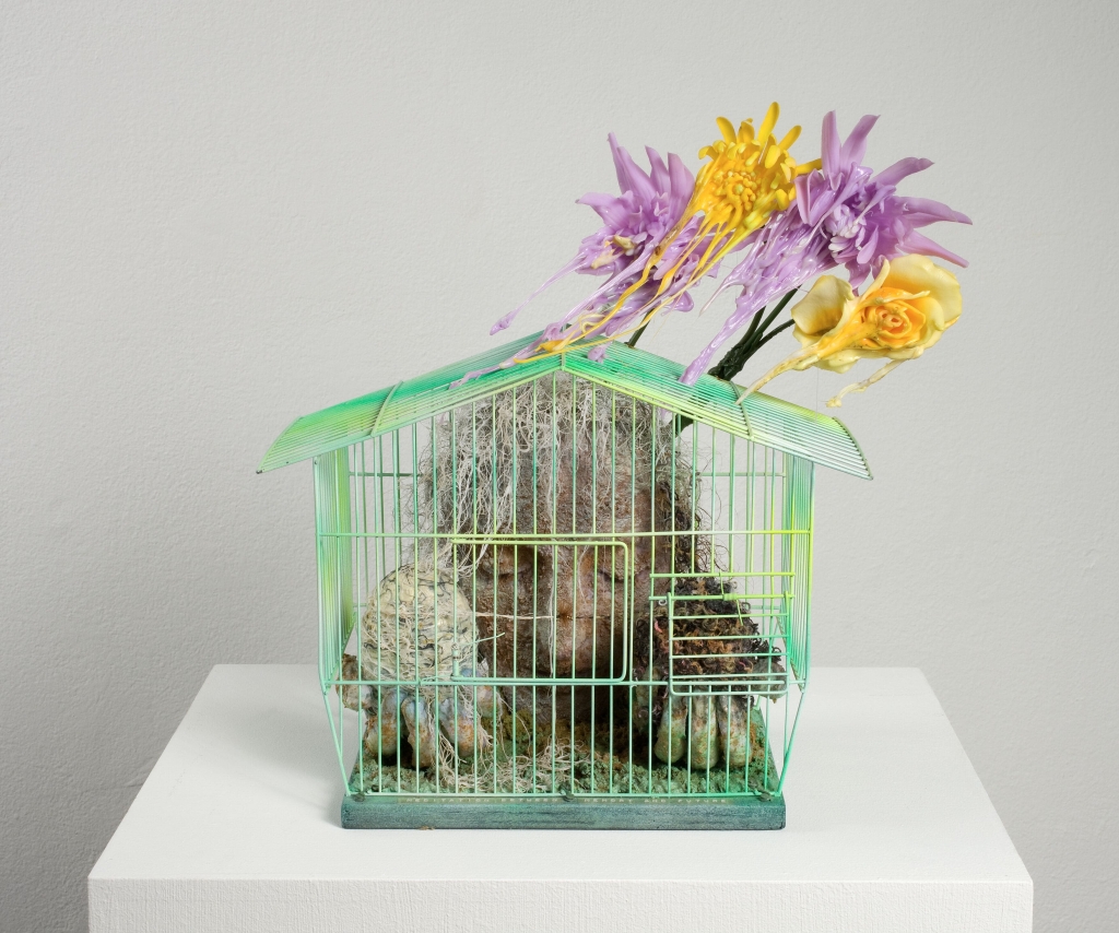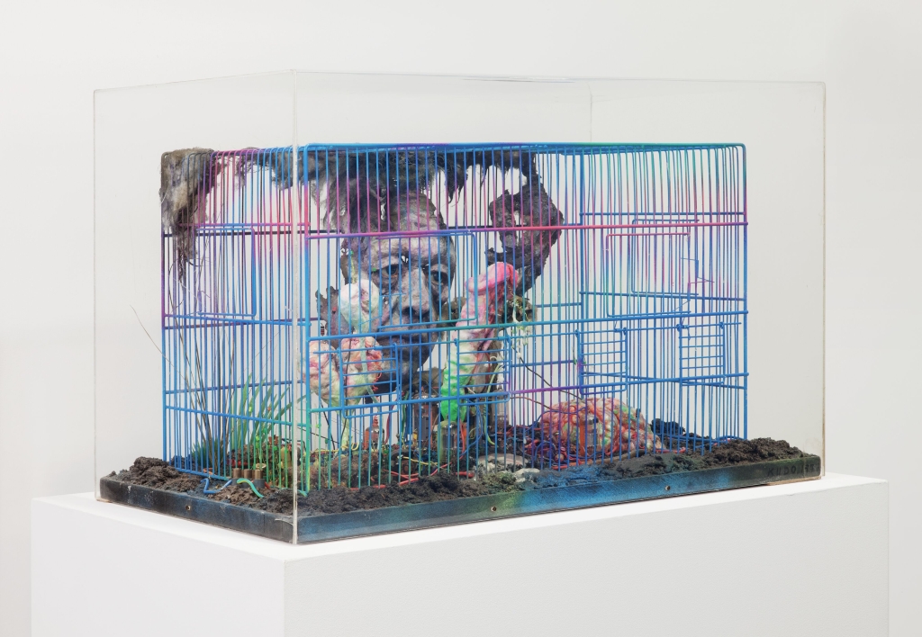 籠子當中的封閉式生態系統,暗喻著發展出高度文明的人類其實就如同被豢養的生物,依附於一種龐大且精密的體制之下生長、被控管與觀察。而這樣的思考邏輯也不免聯想到英國作家阿道斯.赫胥黎(Aldous Huxley, 1894-1963)在1932年出版的反烏托邦小說《美麗新世界》(Brave New World),描述在西元2500多年,由嚴密階層制度與高端科技操控的「世界國」(World State)有著五種屬性的人類,都是在瓶子裡培育而出的規格化產出,以確保眾人皆會依照原廠設定各司其職。此外,有些籠中也煞有其事地安裝著管線、電路板或溫度計等儀器,彷彿在供給或監測籠內環境條件得以讓生物維持在「正常狀態」。這些令人怵目驚心甚至感到不適的造型元素,猶如科幻文學或電影所描述的末日情景——但為了生存,人類終能覓得與科技和自然的共處之道,儘管這樣的運作模式流露出一股隨時都可能崩解的不安感。當觀者穿梭在展場時,每個籠子也像是獨立的星體,因著不同的條件狀態而發展出各異的生態系,整體匯聚成一個複雜且前景未明的渾沌宇宙。