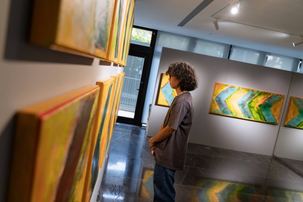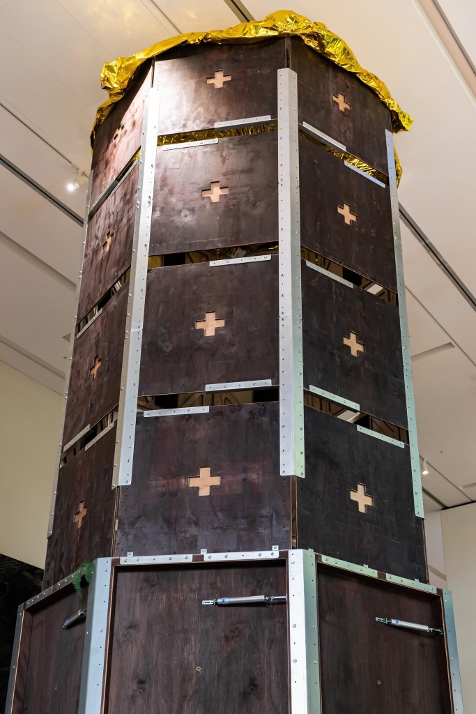 在「猩的展」中藝術家同樣將《左轉彎》系列納入在展場結尾處,門口的第一件作品為木雕版《時間旅行標誌》作為此次展覽的開場,留有與旅行記事有關的伏筆,也潛藏有公路電影敘事在當中。不過一個急轉彎,迎面而來的是一座高聳挺立、高達有六公尺的巨型塔柱,名為《太空漫遊的直立空間》(2024)。
