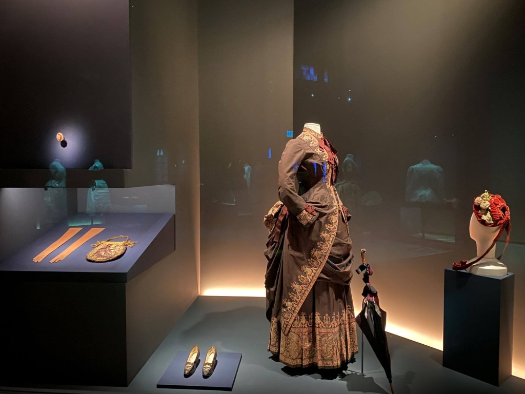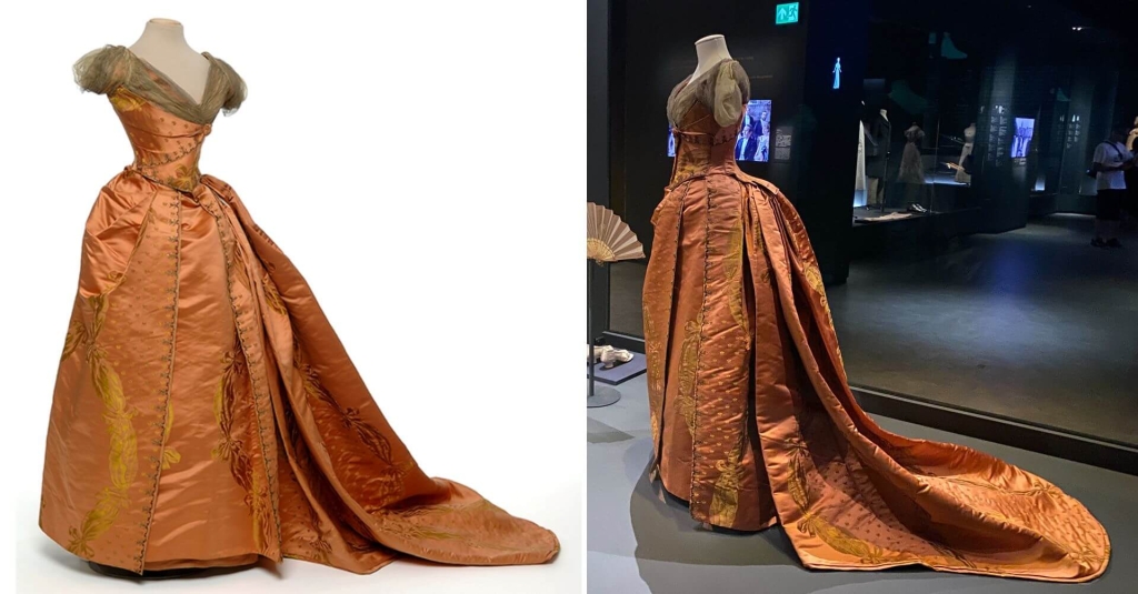 當時的時尚圈以查爾斯.弗雷德里克.沃斯(Charles Frederick Worth,1825–1895)所設計的禮服廣受歐洲皇室及歐美名流青睞,被譽為「高級訂製服裝之父」。他也是第一位推崇設計師品牌、使用模特兒,和開啟時裝表演的歷史名人。展櫃中華麗的橘色絲綢晚禮服,面料裝飾大量刺繡,後腰背近90度直角向外突出長長的拖尾裙襬為1880年代風靡一時的禮服款式,為女性觀賞歌劇或者出席大型舞會的服裝。天后莫文蔚在展覽錄製的粵語導賞中,也特別介紹此件晚禮服,是她最喜愛的展品之一。