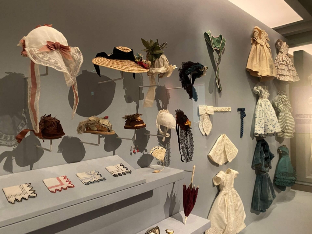 走進展場,一整牆的玩偶行裝,從內搭襯裙、各式裙裝到披肩、帽子、手套等精緻的小配件,無一不是富裕家庭女主人真實衣帽間的縮影。小巧服飾整齊地陳列在訂製櫃架上展示,巧妙點破本次展覽採用「紙娃娃/洋娃娃」形式作為策展及設計的理念。