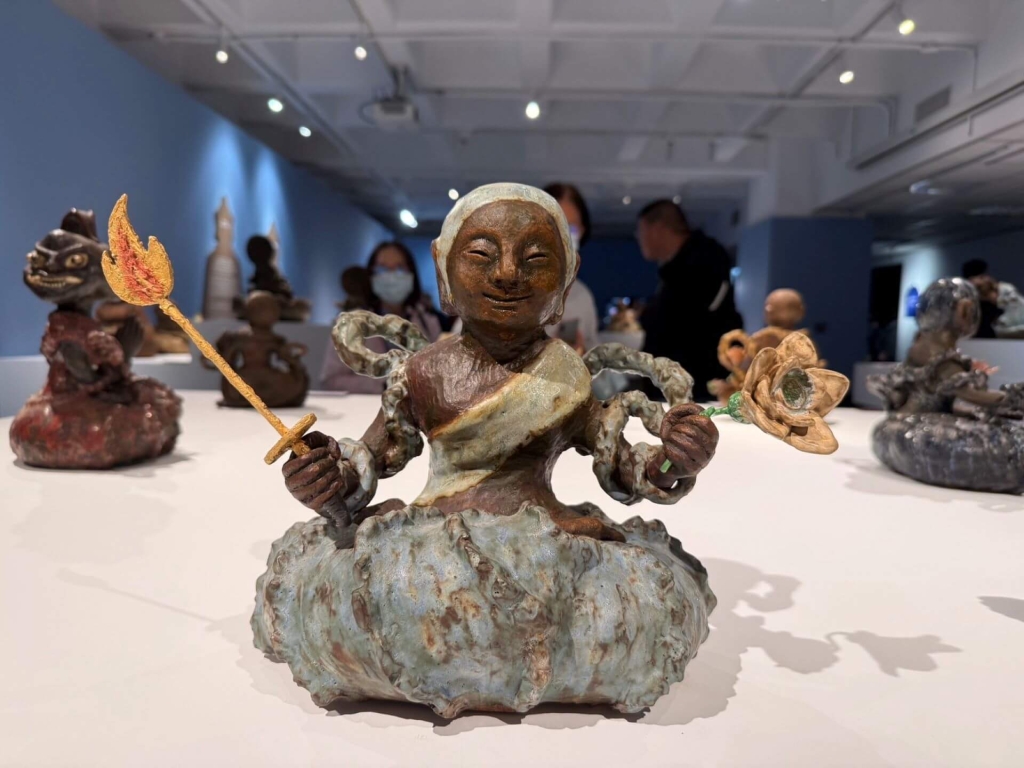 「拈花微笑-連寶猜陶藝創作展」展出連寶猜36件佛菩薩塑像,其所塑造的阿彌陀佛立像如同眾生的母親,以悲天憫人關照著大地眾生。(攝影/朱佑霖)