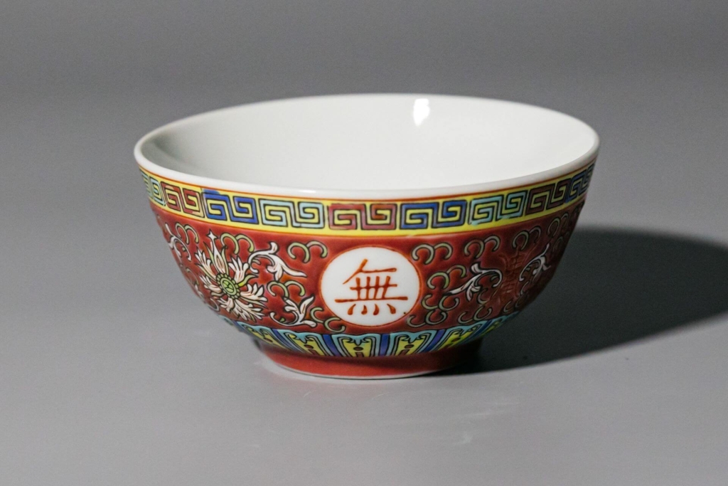 1980年代,中國景德鎮製造,《紅地纏枝萬壽無疆碗》,通體以紅彩為底,四面各有一圓形開光,以鐵紅彩楷書分別書寫「萬」、「壽」、「無」、「疆」。(國立臺灣大學藝術史研究所美術館提供)