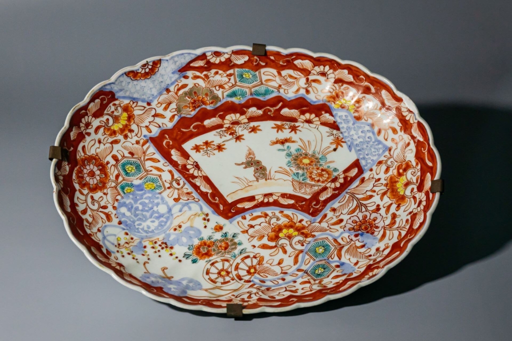 日本明治時期,日本有田香蘭社,《赤繪花卉扇形開光大盤》鐵紅彩為主導色,搭配金、黃、綠,及釉下藍彩。(國立臺灣大學藝術史研究所美術館提供)