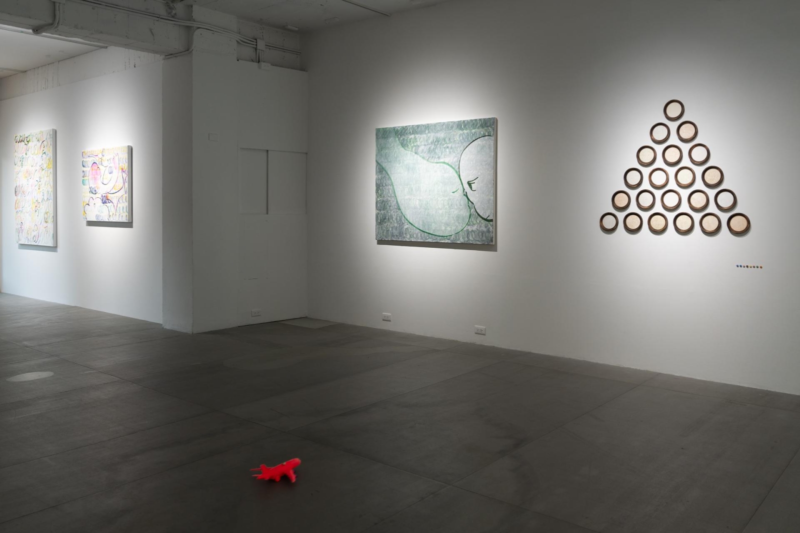 面對李明學本次展件《只有__知道答案》與《頻率》,直接可以聯想到2020年個展同樣利用糖果色素的《隱形詩篇》,以及2016年以茶排列之《光譜》,作品中對於色彩的運用規律有致,而這樣的韻律,以截然不同的形式存在於蕭筑方的畫作中:環迴繞圈的筆觸,是她狀擬作家文思泉湧、情感流暢抒發的狀態,希望藉由顏料的堆疊,維持連續不斷的氣韻,並展現時間的流動。如此的創作章法發展至今已經邁入第五年,原先畫作背景多以平塗呈現,對於筆觸相當抗拒不安的她,竟是在文具店受到啟發——買筆時撞見試寫紙上隨意的塗鴨,縱使作者可能只是陌生的學童,卻能在簡單的線條中透露出其人格性情,開啟了她層層纏繞、反覆「書寫」的作畫習慣,讓畫布成為她快然自足的抒發憑藉。