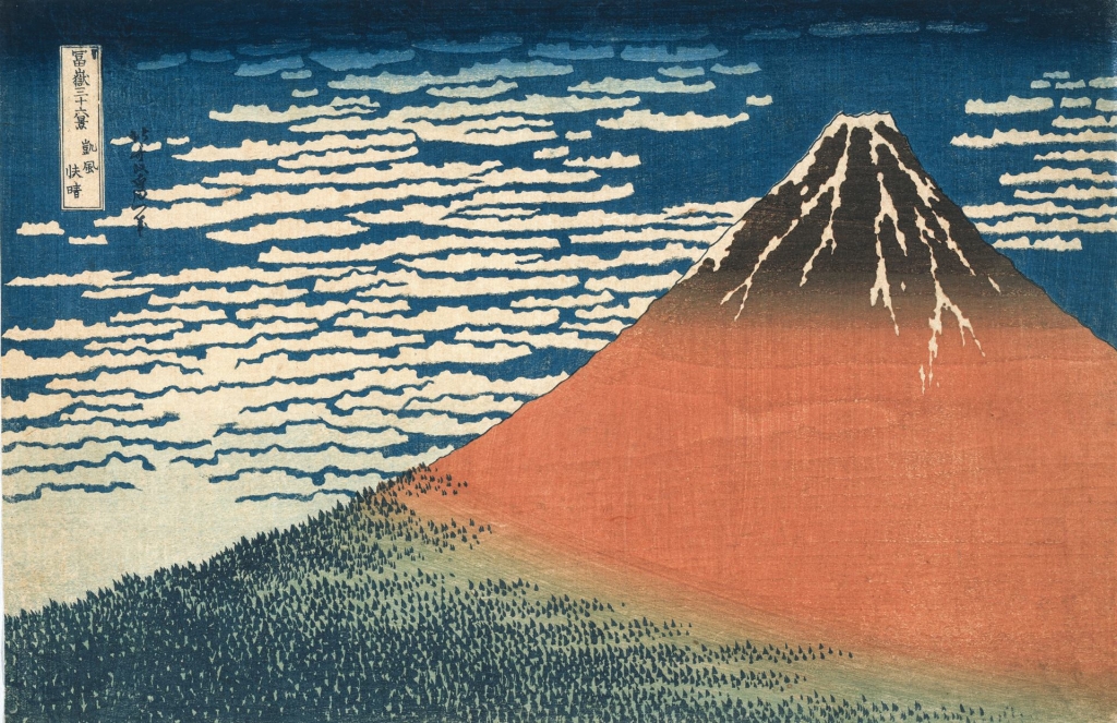 如果〈神奈川沖浪裏〉是誇張激情的戲劇表現,〈凱風快晴〉便是如神靈般的巍然存在。夏末初秋,冰雪稍融的富士山,在早晨或夕陽的日光照耀下呈現出鮮豔的赤紅色,形成了著名的「赤富士」。如此罕見美景,須具備有一定的自然條件,觀者才有緣得見,也因此象徵著好運吉兆。北齋筆下的「赤富士」,山體沐浴於朝陽折射呈現大面積赤紅、山腳下點點成片的樹海、山頂積雪融水,湛藍晴空的白色卷積雲,似受南風「凱風」吹拂而漂浮著,而有著「快晴」之感。以「錦繪」(多色套印版畫使作品呈現出如織錦般豐富多彩)來說,使用顏色算少,但構圖簡潔鮮明大氣,精彩地表現出神聖的「赤富士」,宛如鏡頭快門的一瞬,感受到強大的生命力。又,此前日本藝術大師在描繪富士山時,多繪以白色或白雪籠罩著綠藍色山體,北齋則大膽地以赤紅色顯現,初刷時為具層次較淺的紅褐色,猶如朝陽漸升時刻,但到了後期印刷顏色卻變得越發赤紅飽滿,或也可解釋成庶民對於紅色富士的印象認同,強烈的視覺更符合期待喜好。