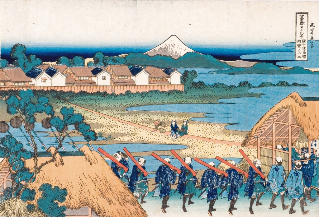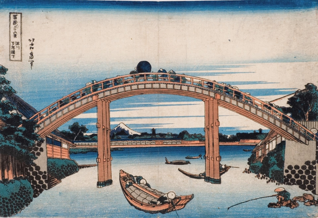 富士山是日本最高峰,主峰海拔3776公尺,自古以來被視為聖山,跨越靜岡縣和山梨縣,幾乎位於日本列島的中央,能看到富士山的地點遍布全日本20個都府縣。即便在今日的東京市區,於晴空萬里時的大樓間隙裡,都還有機會看到富士山,更何況是沒有高樓大廈的江戶時代,富士山就存在於市井生活裡。〈深川萬年橋下〉,萬年橋位於江戶的深川地區,這裡因地勢較低而需築起高聳的石堤來防洪。橋樑高聳於石堤之上,使得觀者能夠感受到其壯觀的高度與結構之美。河中兩艘船的船頭,則將觀者的視線引導向橋下可見的富士山。這座橋橫跨小名木川與隅田川,連接了江戶的重要交通要道,畫中描繪的繁忙景象也反映了江戶時代發達的水運系統與都市生活的繁榮。