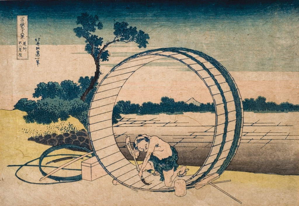 〈尾州不二見原〉描繪的地點是現在愛知縣名古屋市中區不二見町附近,展現了北齋擅長的獨特構圖與透視技法。他巧妙地運用了「借景」的概念,讓觀者透過桶子的巨大圓形框架,觀看遠方小三角形的富士山,透過大小、形狀的強烈對比,構成有趣的視角。〈從千住花街眺望富士山〉則是從南側山谷眺望花街柳巷新吉原(現在的台東區淺草望向千束)的情景。手持火槍和長矛的大名隊伍,正朝著領地返鄉,幾個人抬頭望向遠處的富士山。街道旁「千客萬來」茶店裡旅人正在歇息。兩位農婦坐在田埂上,望向著行進間的隊伍。畫題中所寫的「不二」為富士山最常見的日文漢字之稱。