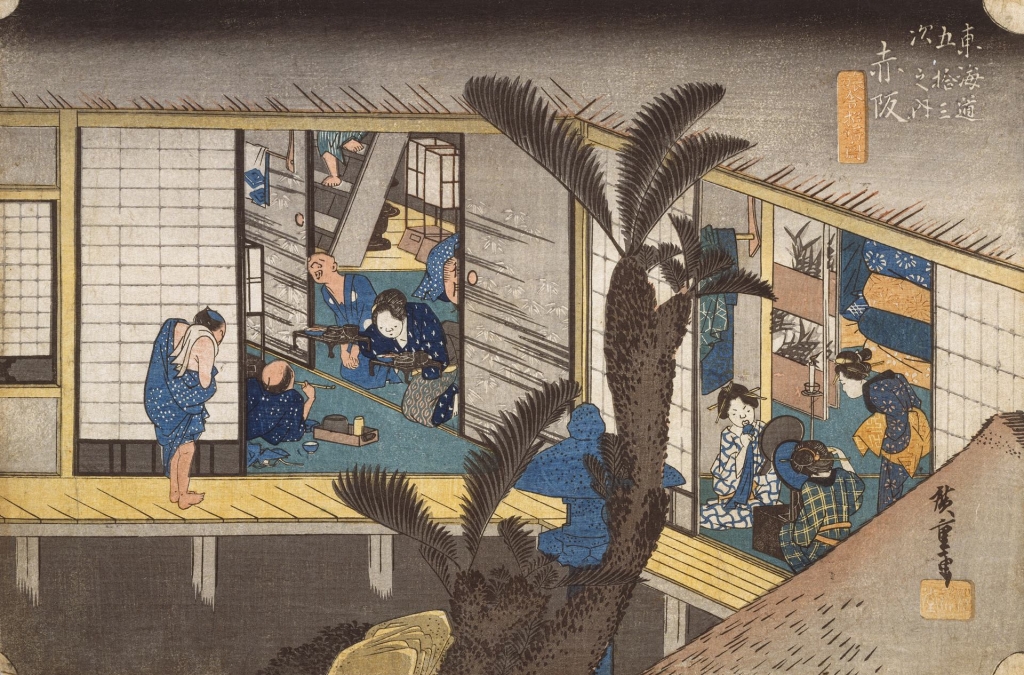 〈赤阪 旅舍娼婦圖〉是此系列唯一以室內為場景的作品,也讓我們對江戶時代的「旅籠」有著更具體的想像。赤阪為今愛知縣豐川市。旅舍中庭的鐵樹將場景分隔,左側房間裡一男子手持煙管橫躺,女僕正端著兩份餐點面向他,樓梯上腳則暗示出有二層樓。旁邊一位按摩師正準備進行按摩服務。仔細一看,掛置的手巾有著廣重的「ヒロ」假名組合紋樣。右側房間裡幾名女性正梳妝打扮,可能是當時的娼婦、藝妓或侍女,為接待客人做準備。