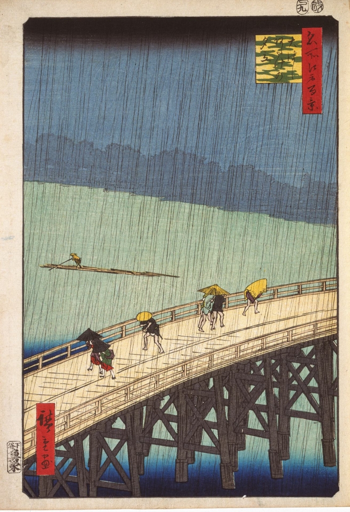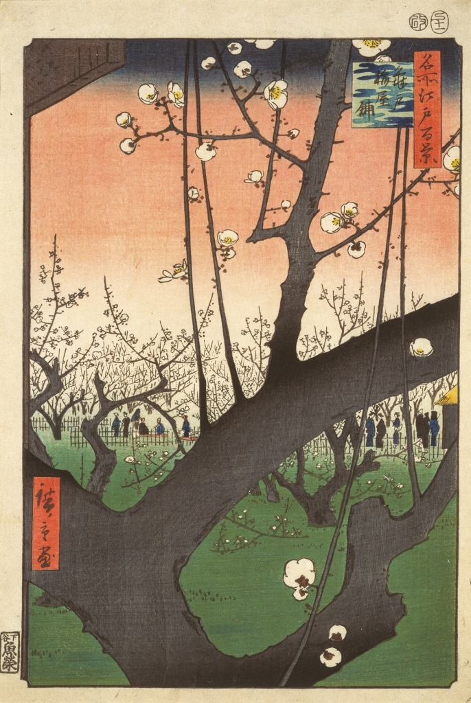 〈大橋安宅驟雨〉應是最著名的一幅。俯瞰視角為從日本海隔著大橋望向隅田川上游。夏日午後橋上行人披著斗笠、撐著傘,彎腰低頭,疾走避開突如其來的傾盆大雨。細密的長線條以不同角度交叉落下,表現出急驟強勁雨勢,墨色雲層則加深了天氣瞬變的戲劇性。遠處樹影朦朧地隱沒在雨幕之中,營造出強烈的空氣感與深度。河面上蓑衣船夫平靜如常,與匆忙避雨的橋上行人形成鮮明對比。〈龜戶梅屋舖〉描繪梅花名勝「清香庵」,前景以粗壯曲折的梅樹主幹橫跨畫面,視覺印象強烈。梅花在枝頭綻放,與遠處的梅林相呼應,營造出深遠的空間感。背景的天空呈現迷人的漸層色彩,從溫暖的橙色過渡到靜謐的藍色,暗示應是黃昏時分,橙色天空與綠色地面也形成美麗對比。遠方的遊客們正在賞梅,展現了當時人們對於自然景色的欣賞與熱愛。無獨有偶,此兩幅作品都曾經梵谷油畫臨摹再創作。