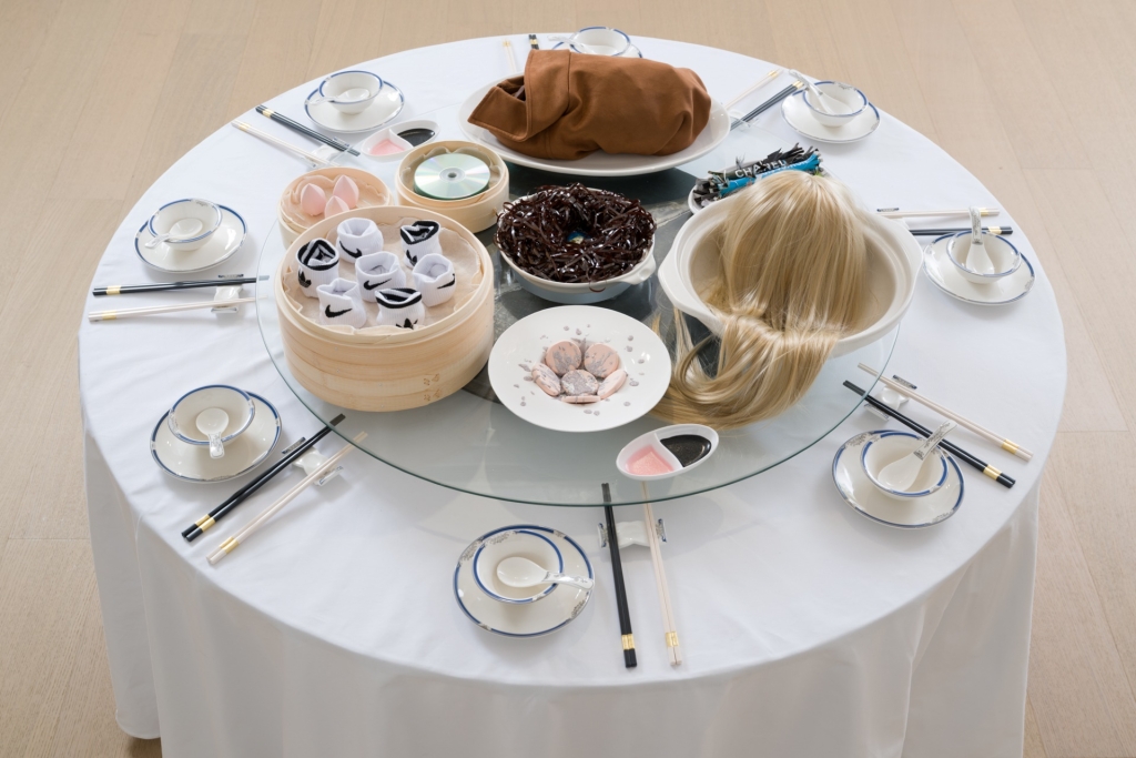 貢坎指出,這次發表的作品有許多中國元素,如:中式餐桌擺設、餐具等,都是他自童年時期就很熟悉的生活物件,反映與探討文化多樣性的滋養。而在展場首度呈現的裝置作品《融合料理》(Fusion Cuisine)採用許多現成物模擬為菜餚,更凸顯當前全球化流動的消費與生活模式,亦緊密扣合「異時.相繫」的概念,如:雜誌裁成條狀的麵條、整疊唱片當作北京烤鴨卷餅、立體粉撲替代的蒸籠麵點等。他也藉此拋出這樣的思考意識:既然大家普遍都對各式料理帶有嘗鮮探索的意願,那麼,對於不同文化與觀念是否也能夠以同樣開闊包容的態度來交流與面對?