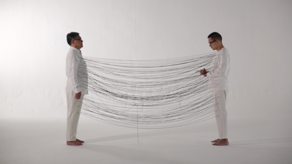 創作於2020年的《期待的禁錮》是貢坎至今唯一的錄像作品,由他與父親一同入鏡拍攝。貢坎坦言,自己與父親其實並不算親密,「我從小就想要有個符合自己期待的完美父親,然而這種期待落差對我們而言都不是件好事、也不快樂,因為對彼此的不理解也時常爭吵以致關係有點緊張。」貢坎決定正視自己與父親的相處狀態,他以連結自己與父親之間的黑色線條象徵那些期待,並由貢坎手持剪刀將其陸續剪斷,作為削減對父親抱持期望的練習,也在過程中重新與父親建立起嶄新的連結關係。這件同樣著眼於「自由」概念的作品,深度回溯了親緣紐帶、聯繫、壓力、切割和離捨的人生經歷;儘管兩人並未有對話,卻展現強大的情緒張力。