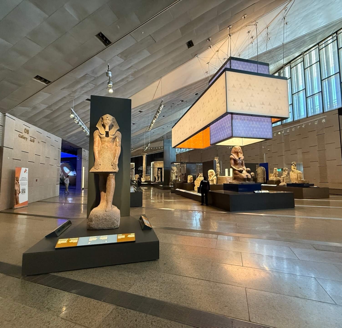 大階梯象徵一步步從出生走向死亡,到達階梯頂端時,可從全景玻璃落地窗遠眺對面的古夫王金字塔(Pyramid of Khufu),再進入展廳。其中,易受氣候影響的藏品置於氣密展櫃內,而大型石造文物則保留於露天或半開放空間中,使展示更貼近文物原始狀態。