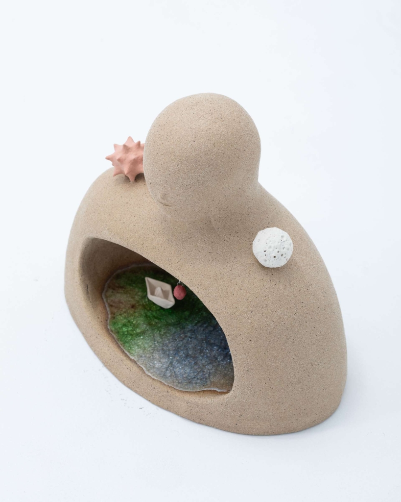 《心臟座標》落實了另一種向內探求的表現方式:一肩擔負太陽,另一肩扛起月亮,但在波光粼粼的心湖裡,紙摺的小船的航程不顧日月,只受到心動時刻的怦然牽引。值得注意的是,本次加入彩色玻璃珠色料燒製,成為藍綠色的湖面,令人驚喜。同樣的的作法也可在另一件半身陶作《房間》發現,更為寬大的身軀被分成五格,張舒嫻透露靈感來自於醫學解剖教學模型,只是將五臟六腑置換為最顯要的回憶與事物,具象表現它們在心中占有的位置,看似不可或缺,在設計上卻可以自由取出置換,涵義耐人尋味。